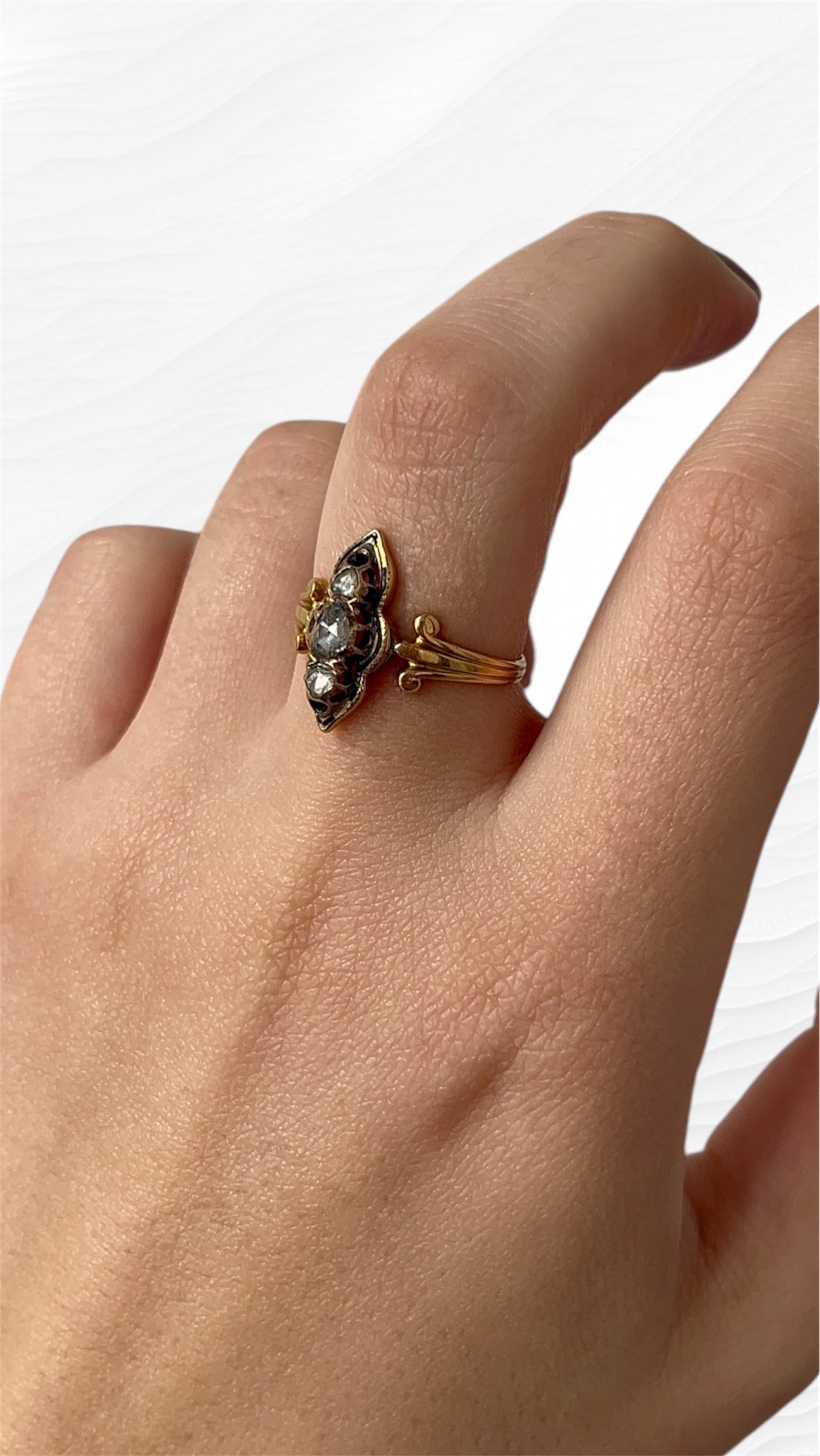 Crafted in 14K yellow gold, this exquisite ring features three Rose cut diamonds weighing approximately 0.30 ct. in total.