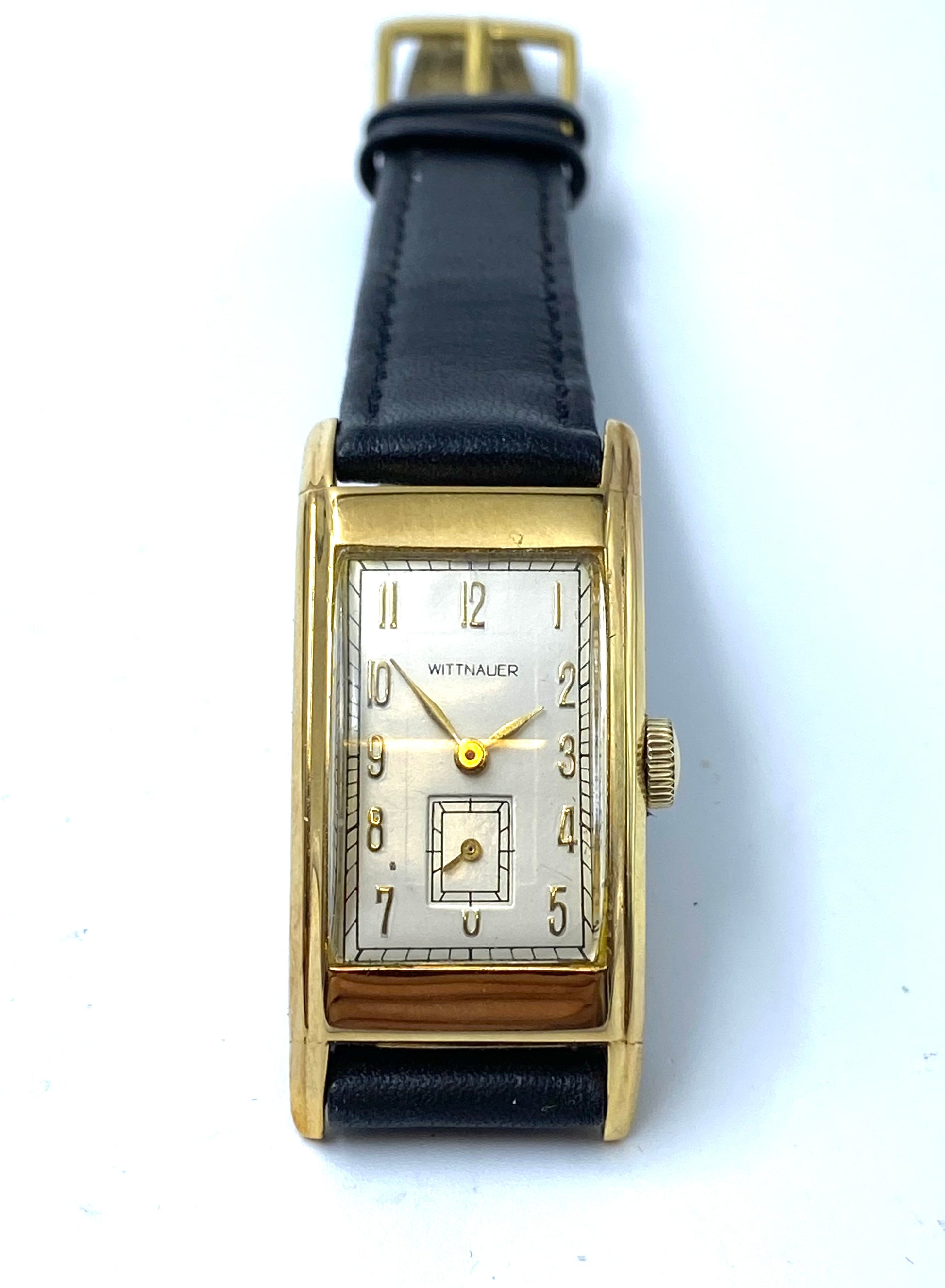 The Wittnauer curvex is an elegant watch with a gold case that harks back to the 1930s.