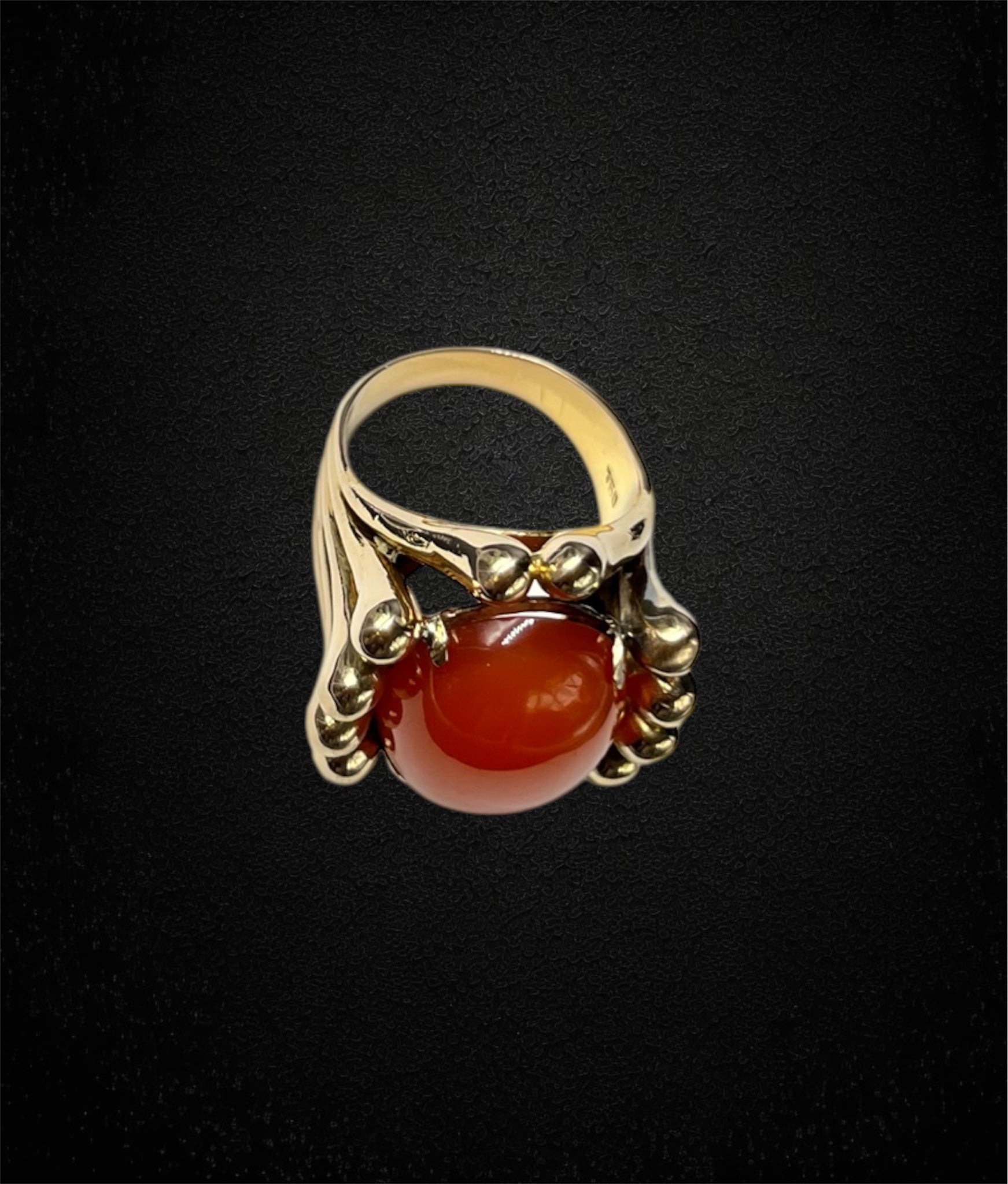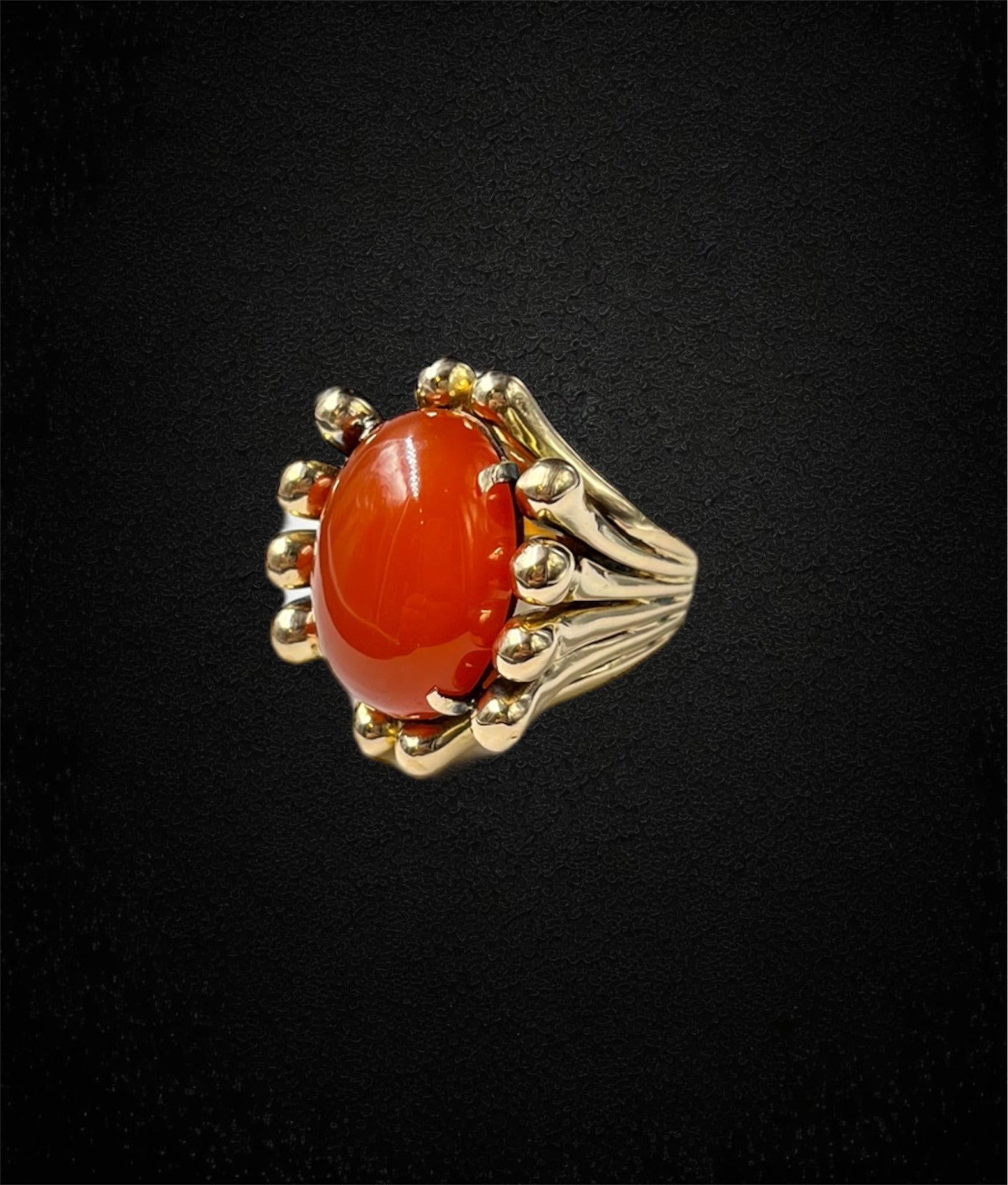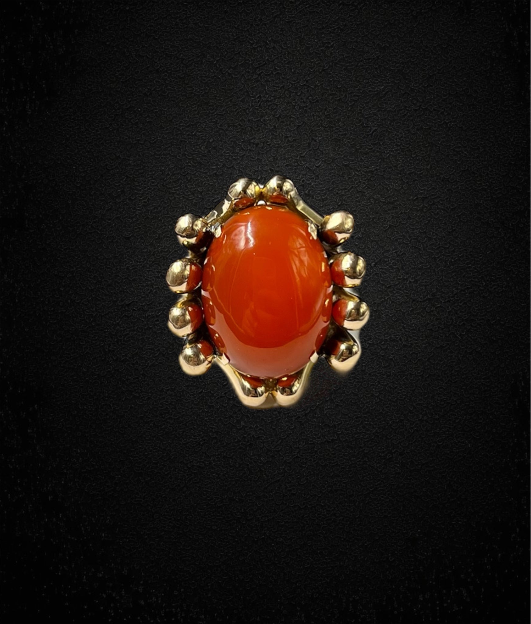 La pietra, dalla calda tonalità rosso-arancio e dalla superficie liscia e levigata, sembra accarezzata dalle “braccia” d’oro che la sostengono con armonia e leggerezza. Il contrasto tra la ricchezza del metallo e l’intensità terrosa della corniola conferisce all’anello una presenza scultorea ma intima, piena di significato.