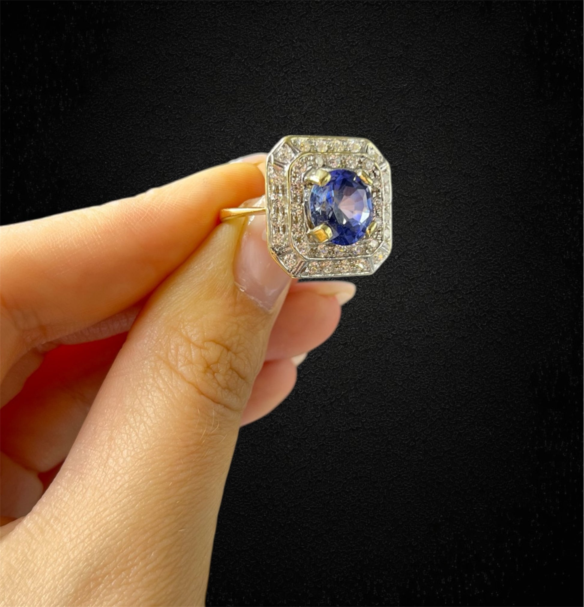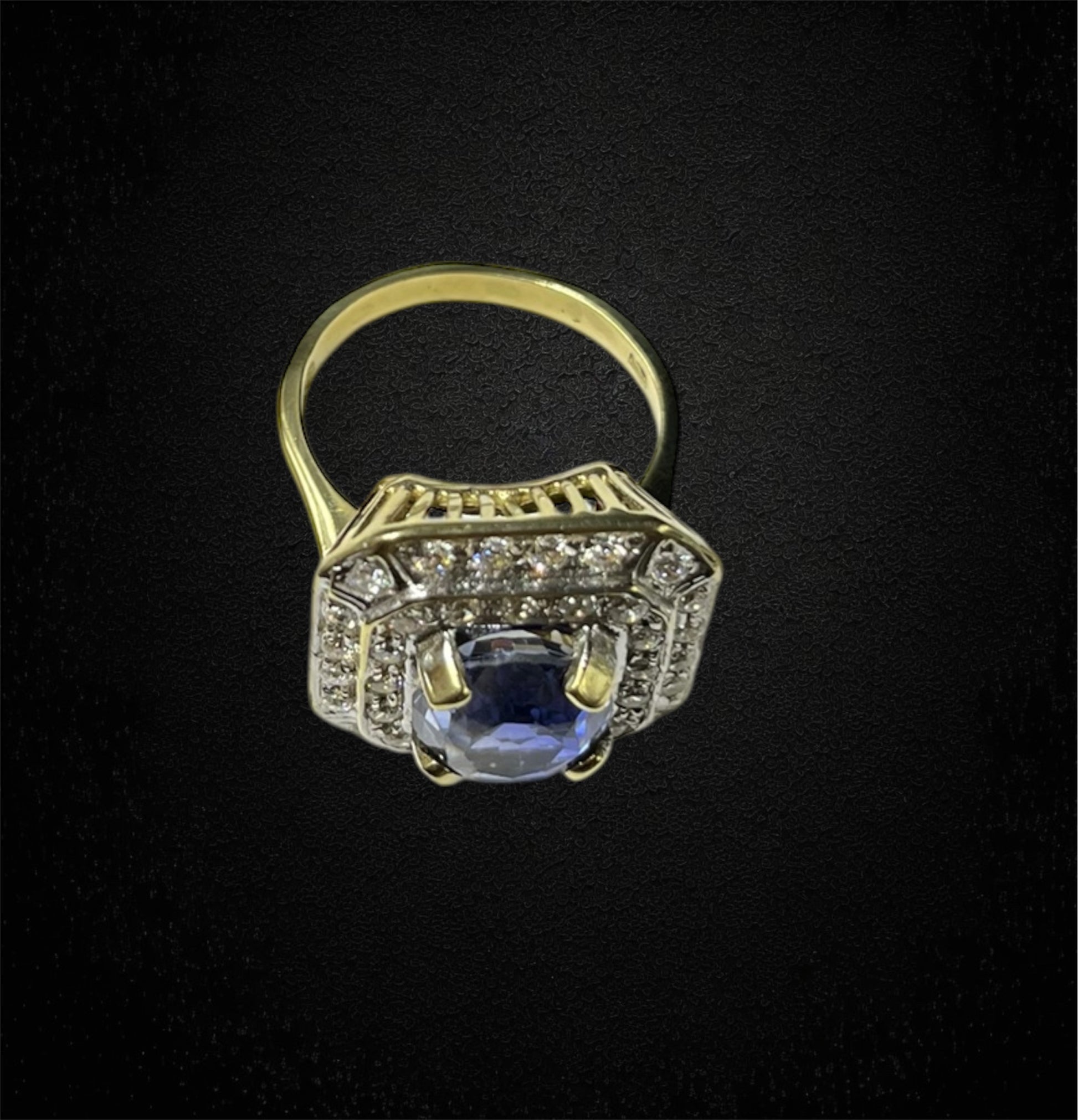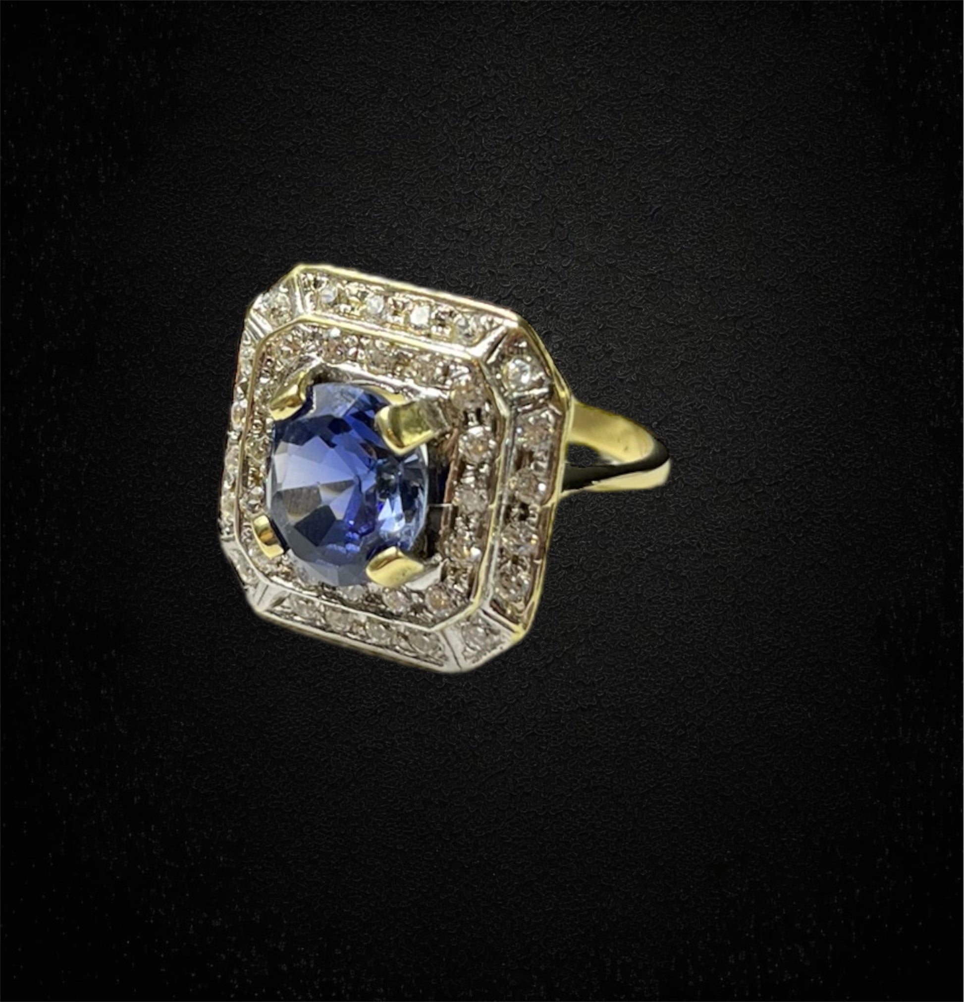 Anello ottagonale a gradini con zaffiro verneuil e diamanti – Italia, anni '80