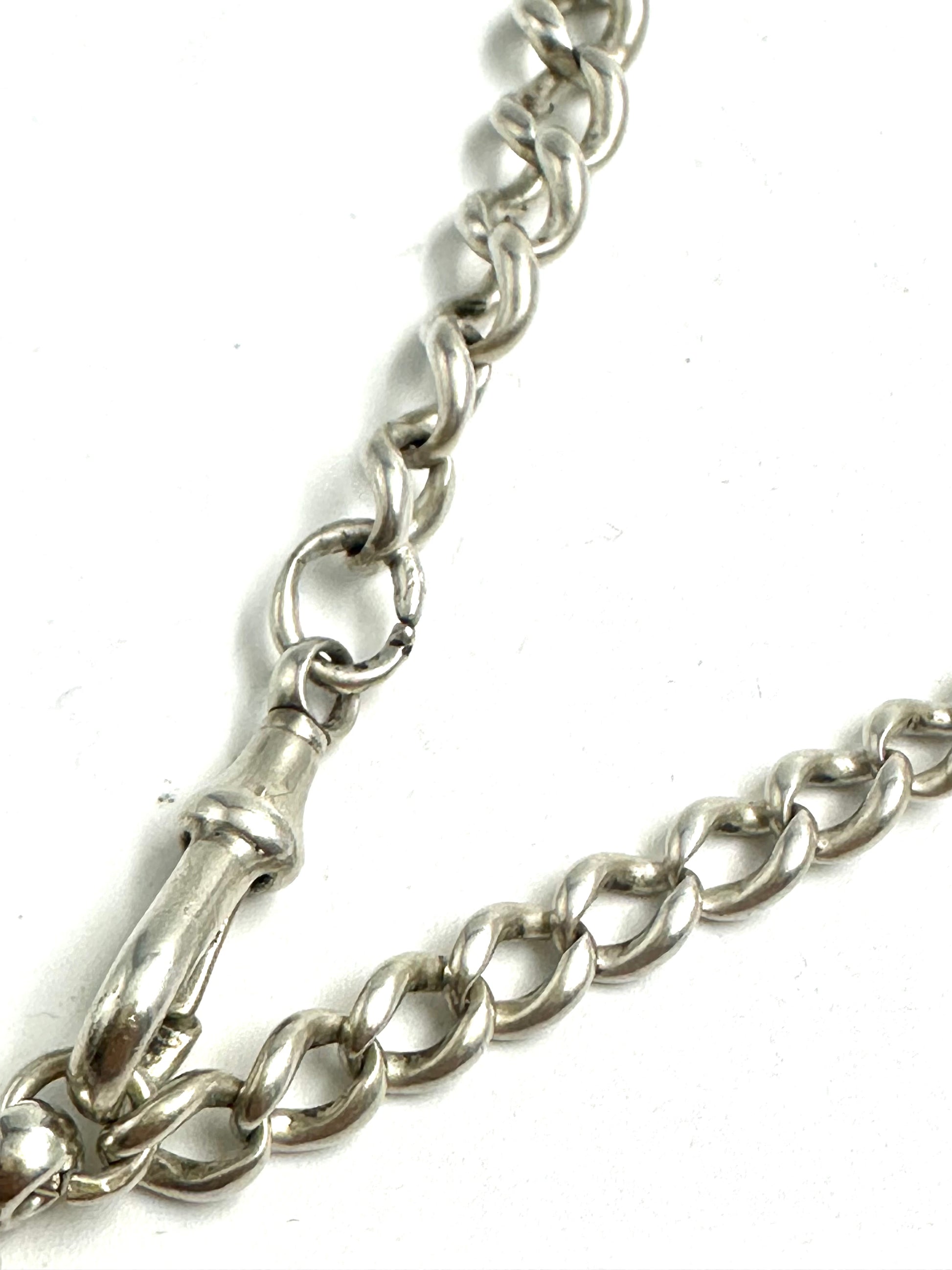 Catena da orologio realizzata in raffinato argento sterling, caratterizzata da una solida maglia groumette, emblema di eleganza e robustezza. La chiusura è affidata a un pratico e sicuro moschettone a molla, che aggiunge praticità senza rinunciare allo stile.