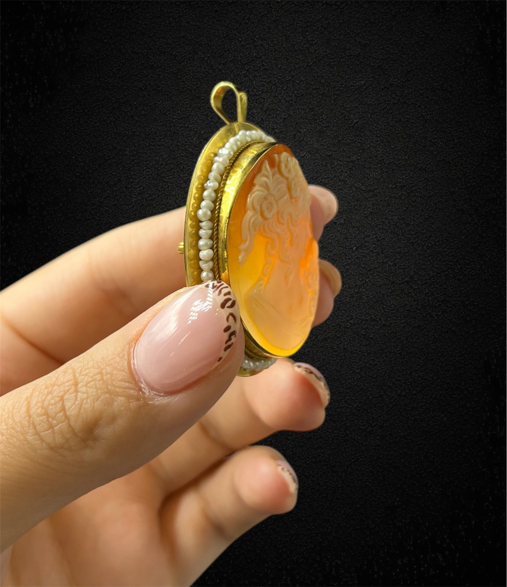 Ciondolo in oro giallo con cammeo e microperle, produzione italiana anni ’60