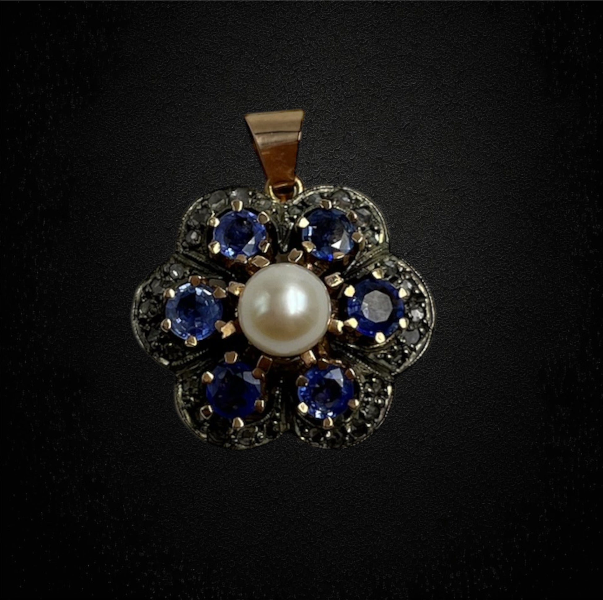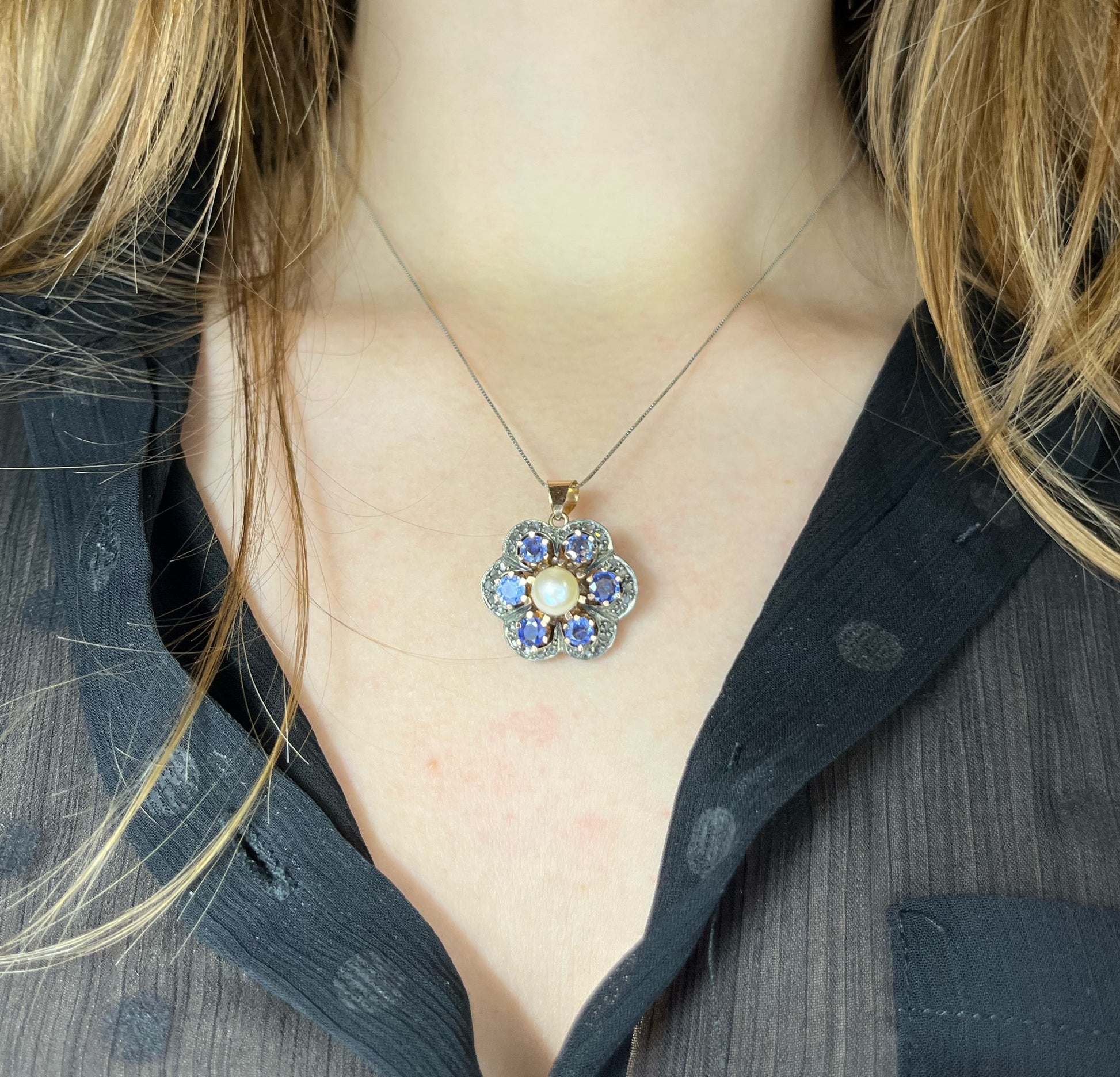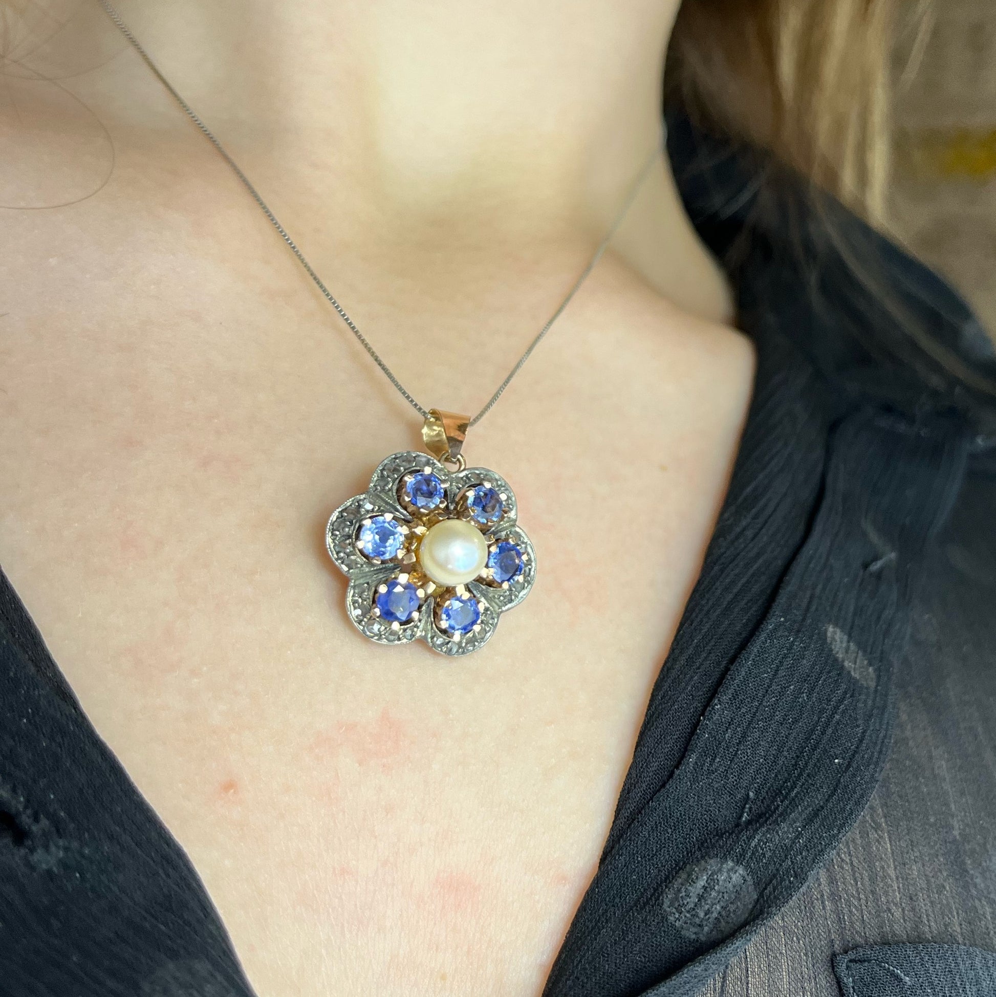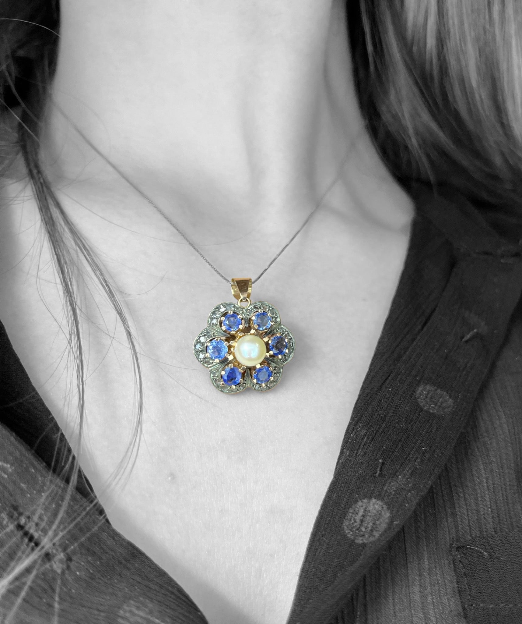 Ciondolo ispirato allo stile ottocentesco, zaffiri, perla e diamanti