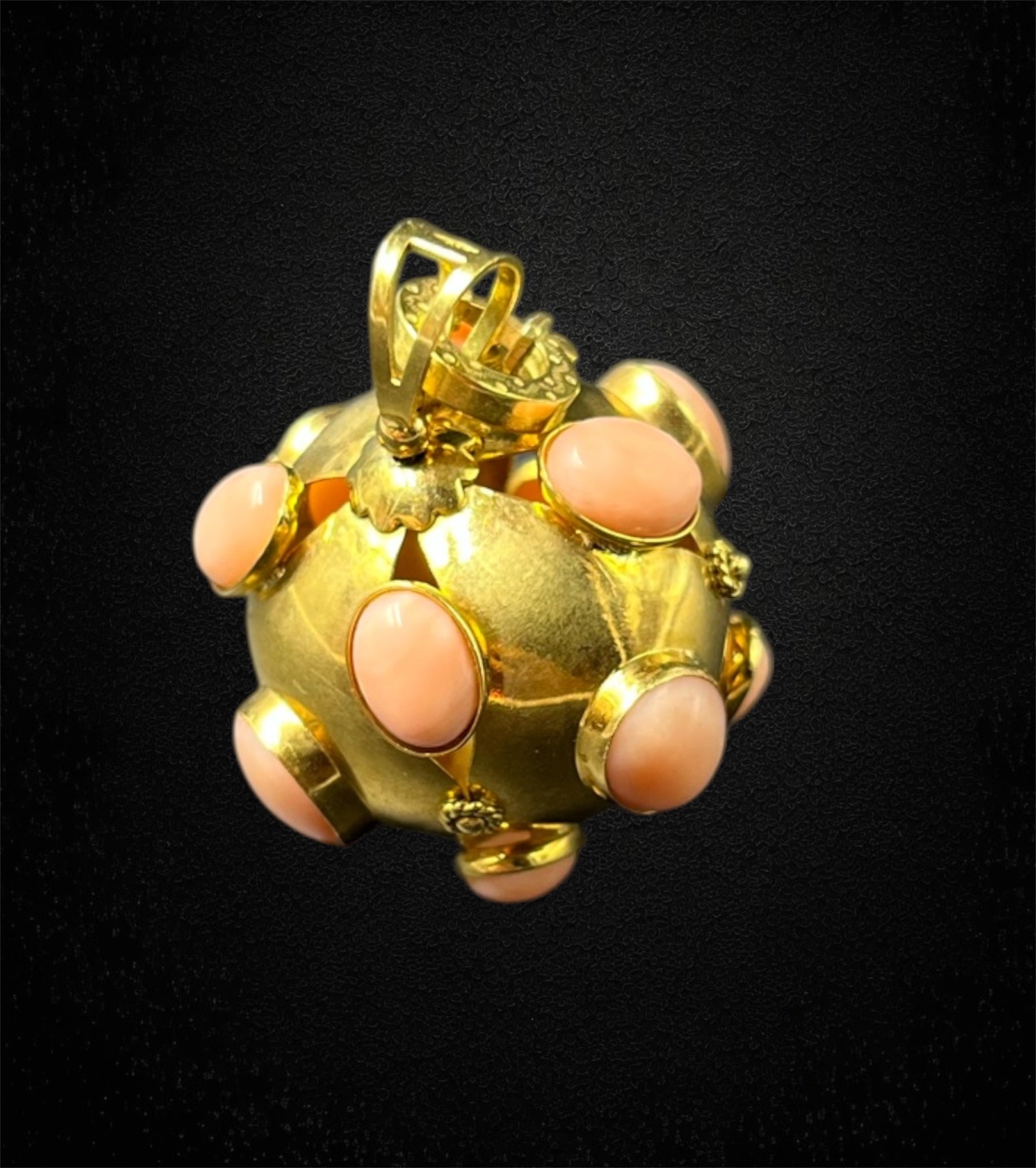 Elegante ciondolo “mina” realizzato artigianalmente in oro giallo 18 carati, frutto della maestria orafa italiana degli anni Sessanta. La superficie è impreziosita da delicati inserti in corallo peau d'ange naturale, lavorati a cabochon con gusto raffinato per donare un tocco di colore e calore alla composizione.