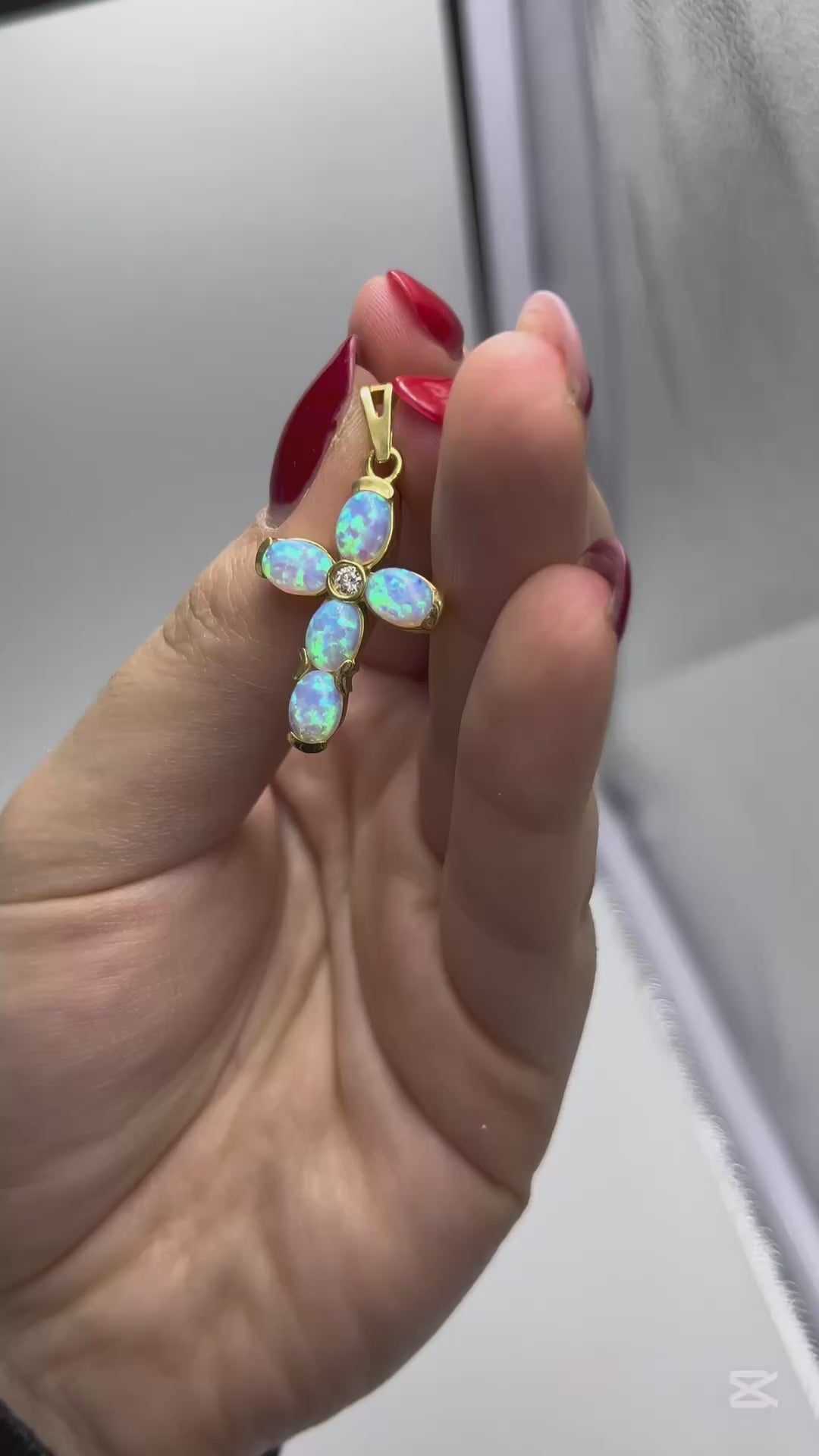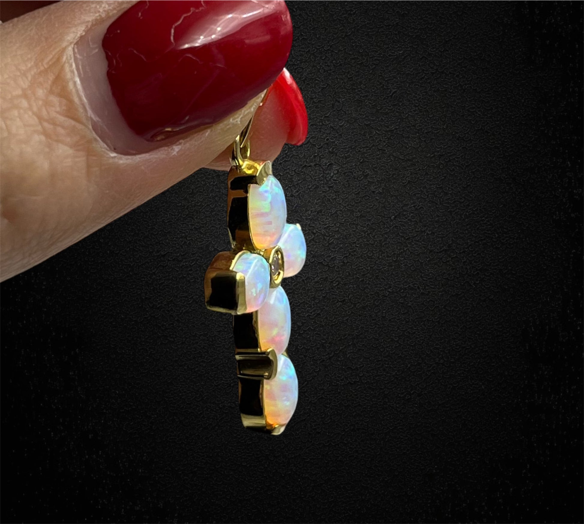 Il design classico ed elegante è arricchito dalla presenza di cinque opali arlecchino, di taglio ovale cabochon, che donano alla croce un meraviglioso gioco di colori cangianti, tipico di questa pietra preziosa.