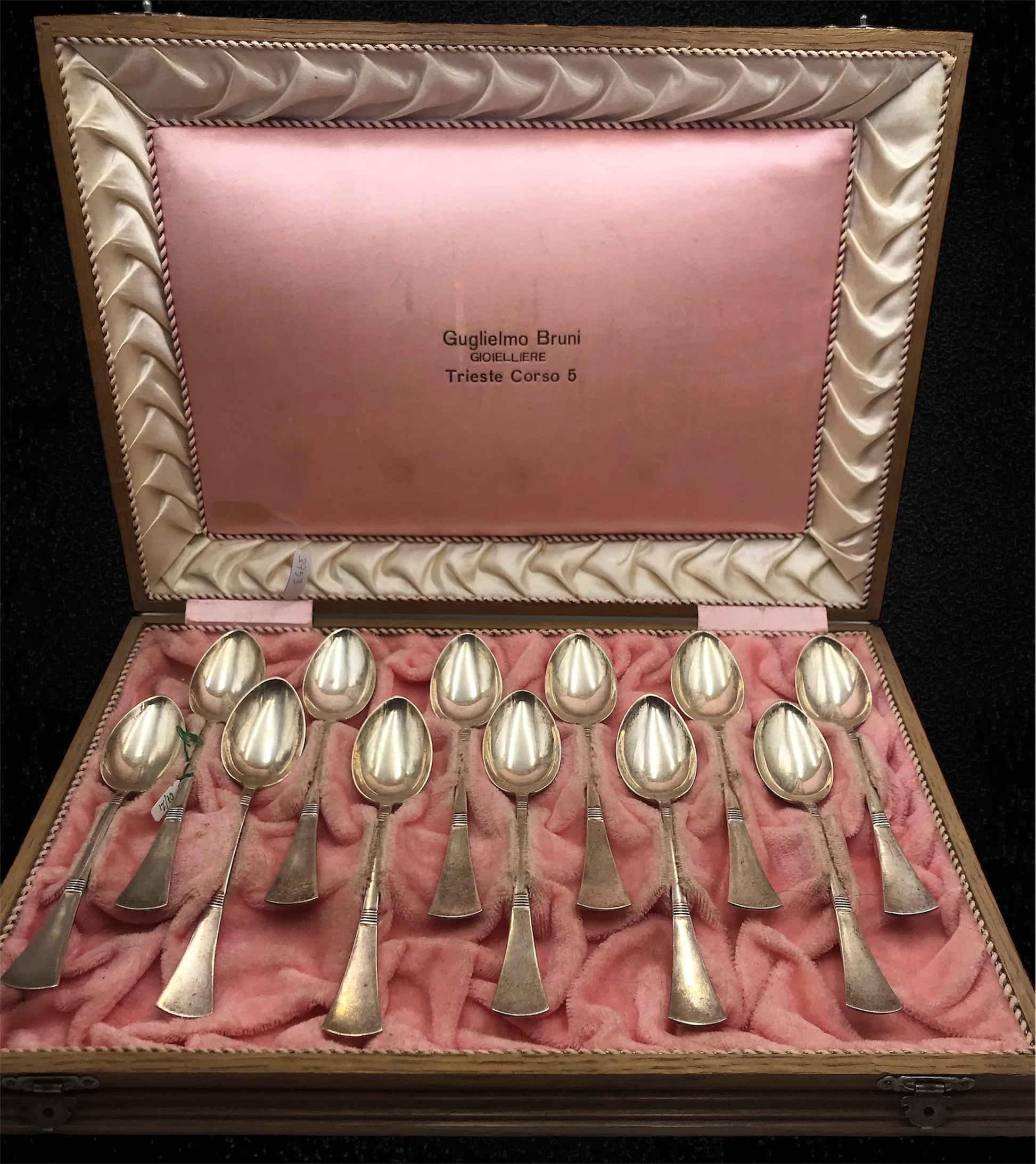 Questa bellissima scatola di legno contiene una straordinaria collezione di 12 cucchiaini da tè, realizzati in argento 830/1000. Ogni pezzo porta con orgoglio il marchio austroungarico, risalente al periodo tra il 1872 e il 1912. La scatola stessa è in condizioni impeccabili, ornata dalla firma di "Guglielmo Bruni Gioielliere" di Trieste, Italia. Un ritrovamento davvero unico e prezioso per gli appassionati e i collezionisti di tè.