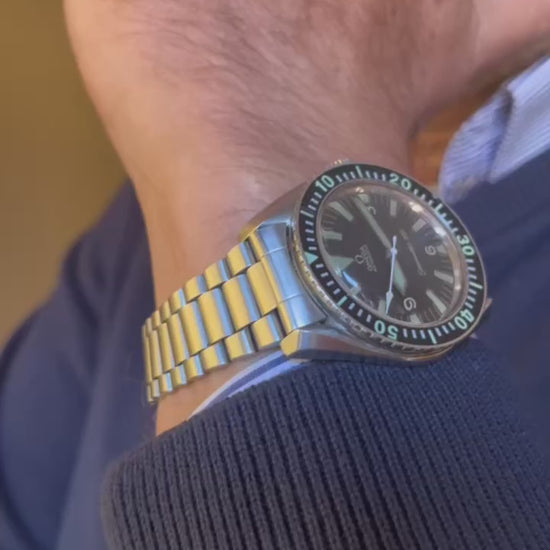 Ogni elemento di design di questo iconico orologio subacqueo si basa su una funzione. Il quadrante ad alto contrasto garantisce una migliore leggibilità. L'ampia cassa in acciaio inossidabile da 42 mm è robusta e protegge il movimento e il quadrante dall'acqua grazie al fondello a vite. La lunetta girevole in bachelite presenta grandi indici luminescenti per facilitare la lettura del tempo di immersione sott'acqua. In combinazione con il bracciale in acciaio originale, il risultato è un look sorprendente e purista che rende questo orologio unico.