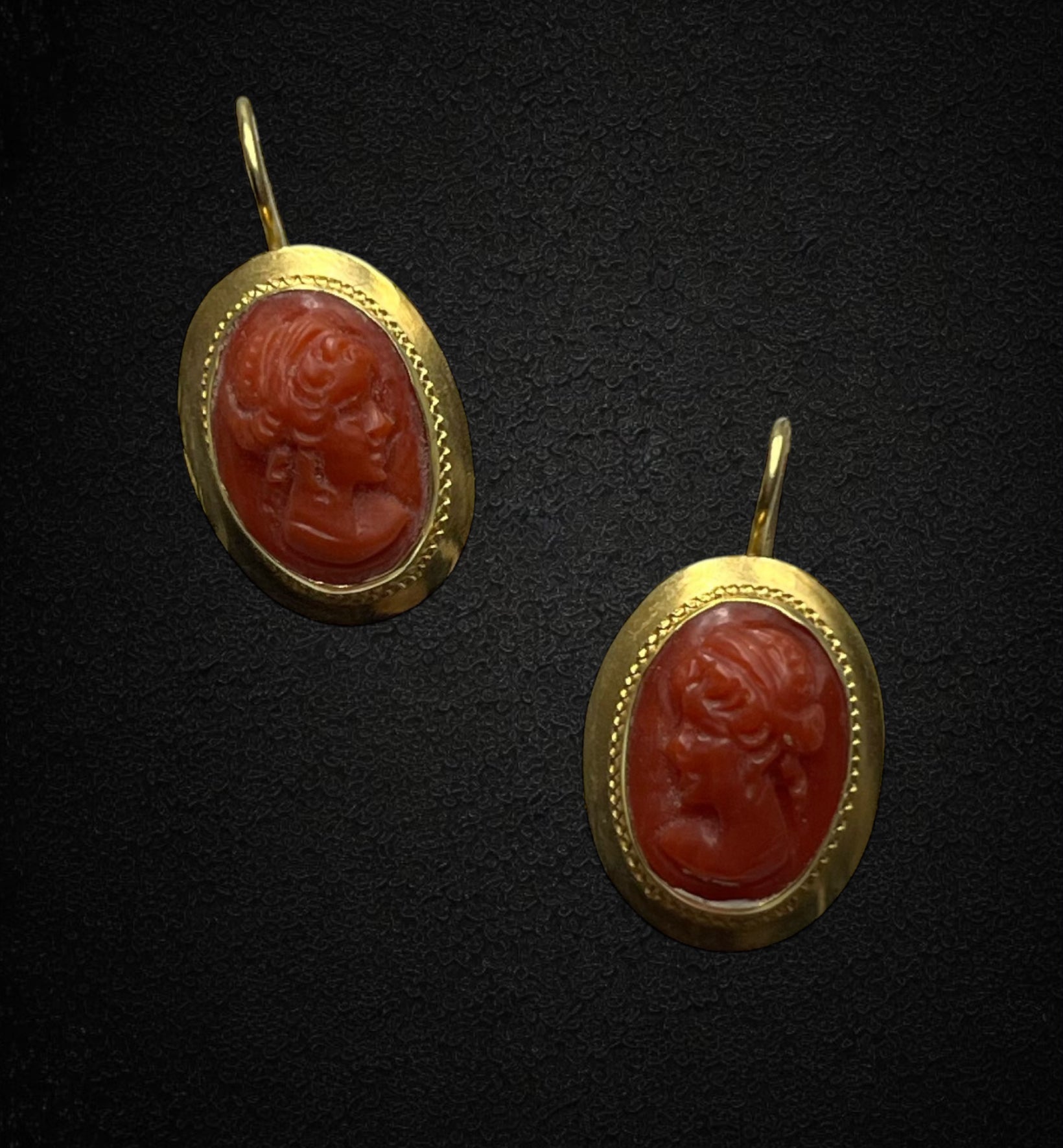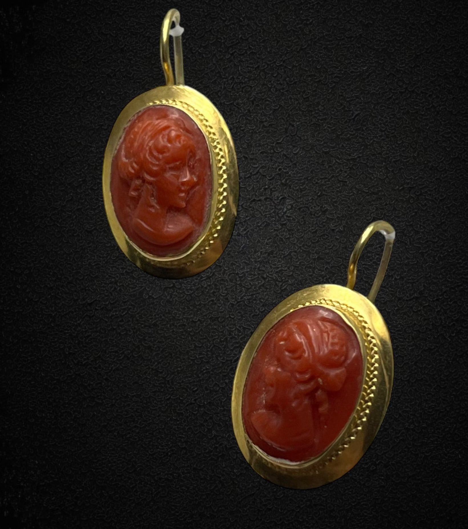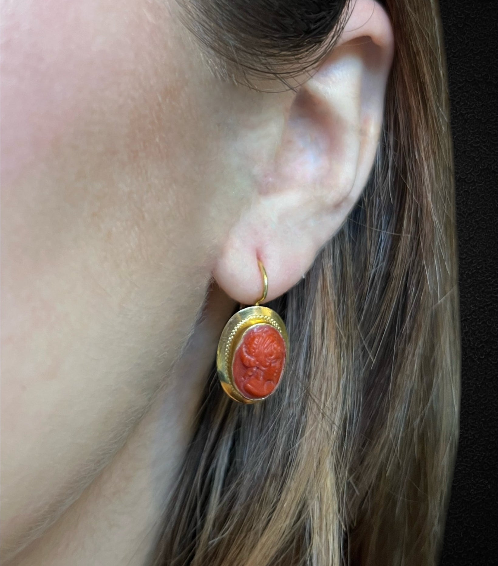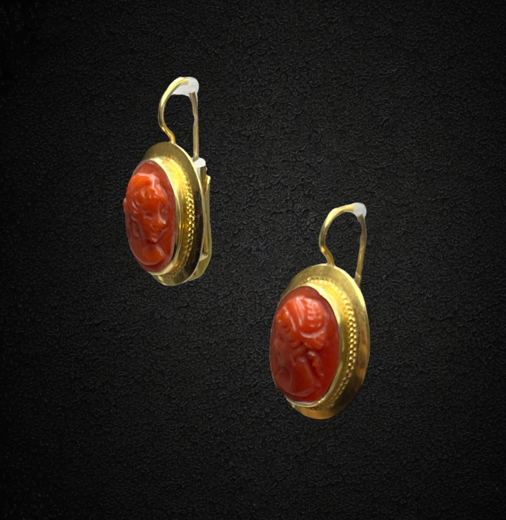 Ogni orecchino è impreziosito da un raffinato cammeo in corallo, finemente inciso per raffigurare un volto femminile di ispirazione classica. I dettagli minuziosi del profilo, dall’acconciatura ai tratti armoniosi, evocano l’arte scultorea romana, donando un fascino antico e sofisticato.