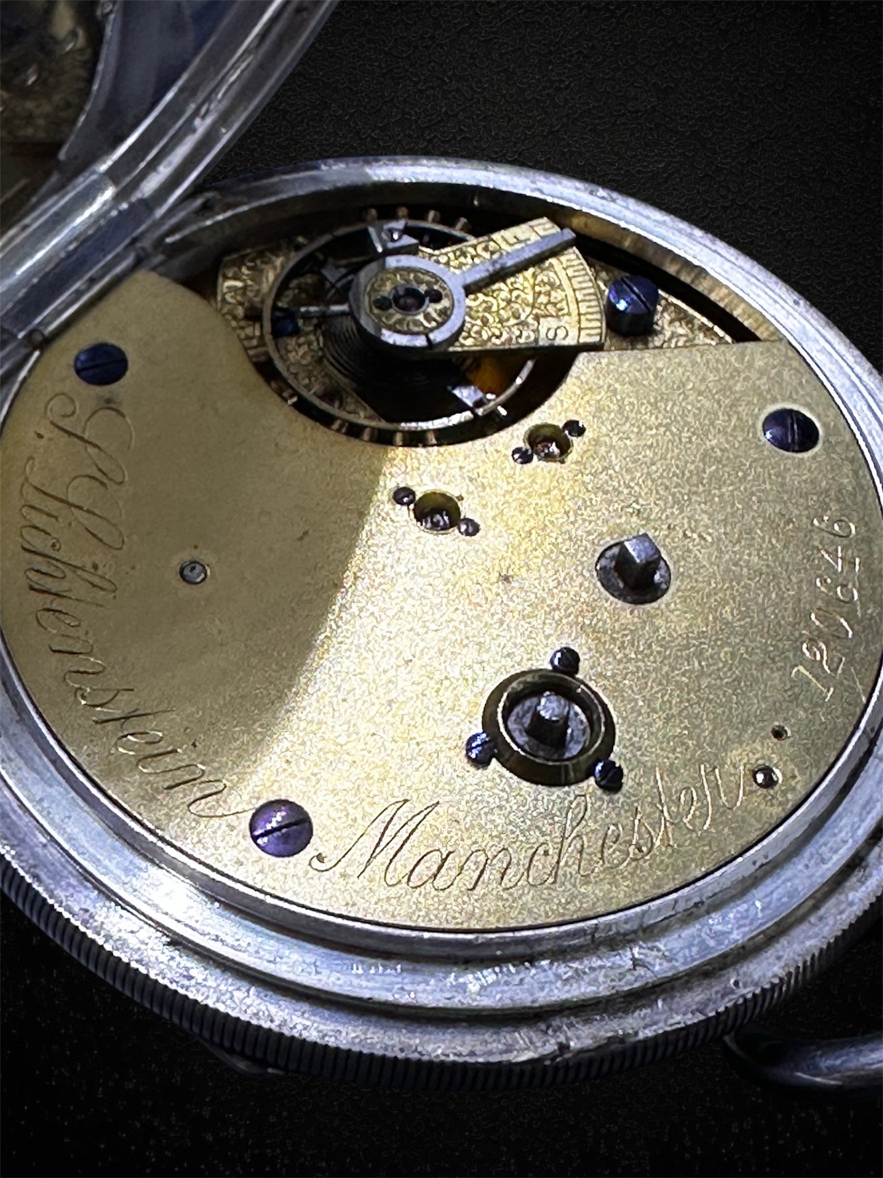 Questo cronografo da tasca rappresenta un eccellente esempio di orologeria inglese fine XIX secolo, combinando precisione tecnica e design elegante. La cassa Chester 1894 conferma l’autenticità e la datazione in argento sterling britannico, mentre il movimento Lichtenstein di Manchester testimonia l’elevata qualità costruttiva dell’epoca. La funzione cronografo con secondi centrali e scala tachimetrica esterna rende questo orologio particolarmente interessante per collezionisti di strumenti di misura del tempo e cronografi storici.