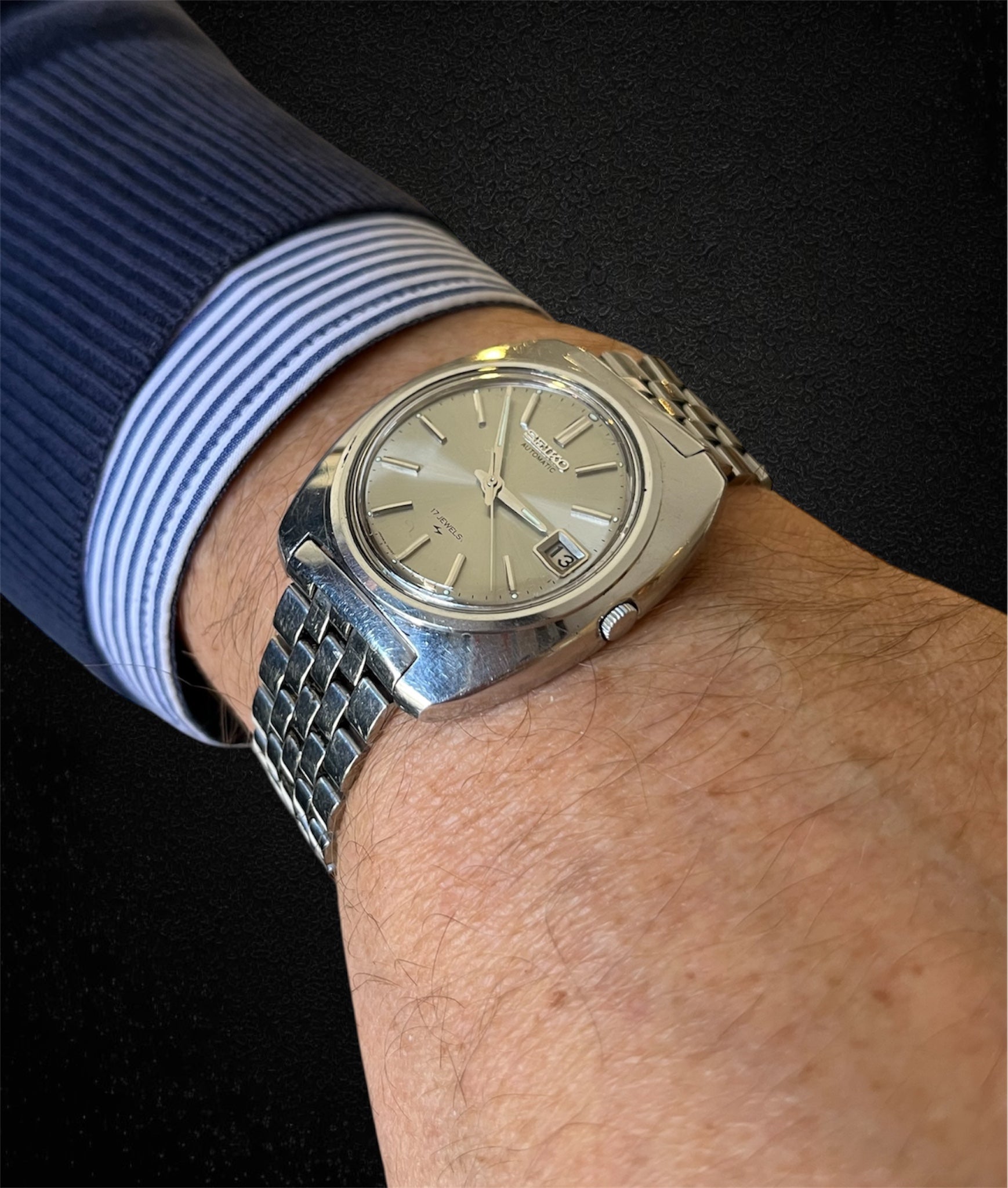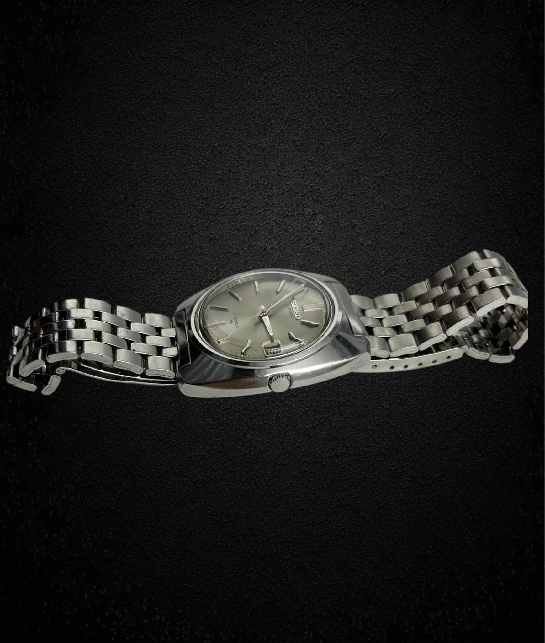 Il quadrante argento satinato, arricchito da un datario a ore 3, conserva tutta la sobrietà e la leggibilità tipiche degli orologi Seiko dell’epoca.