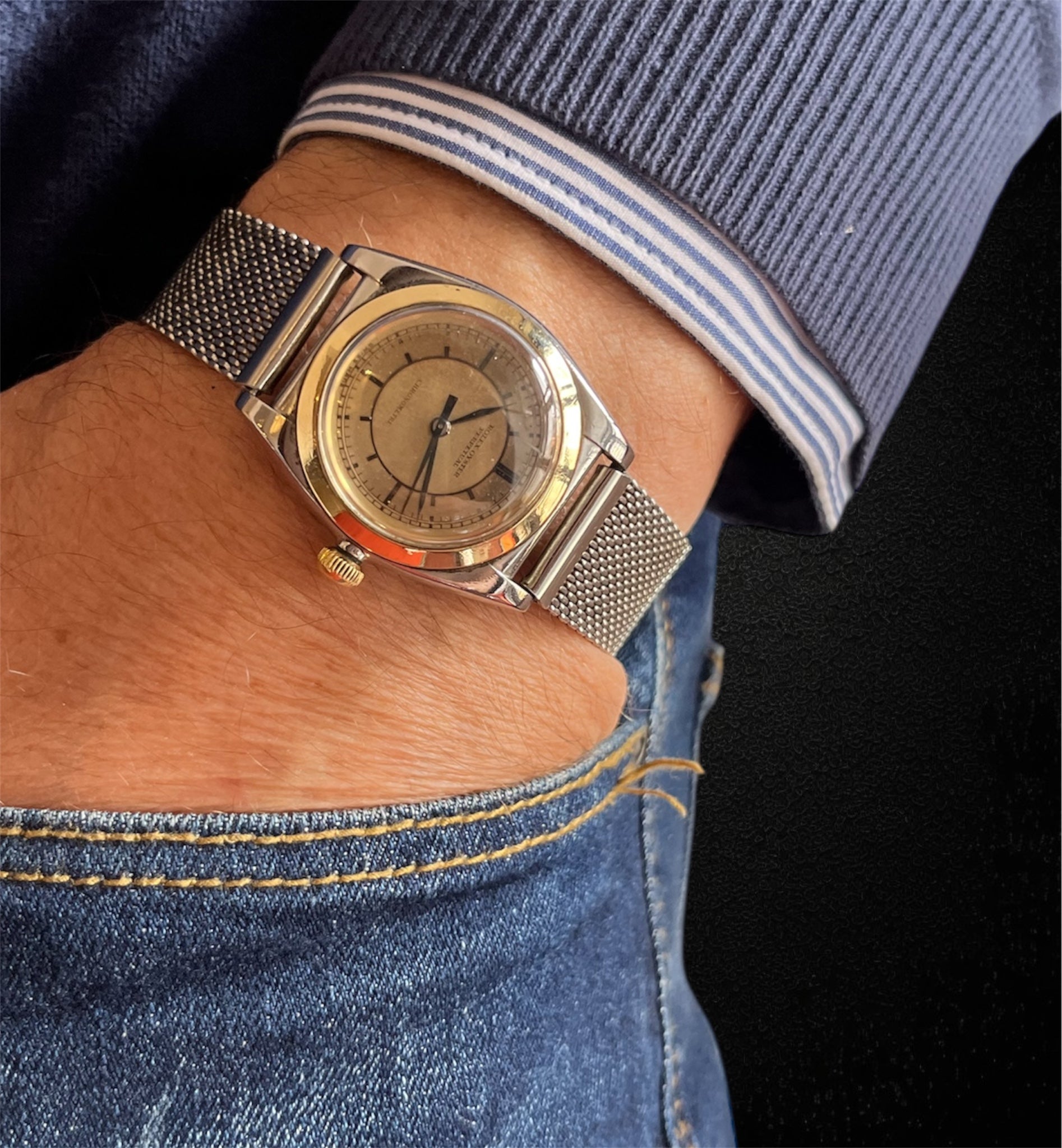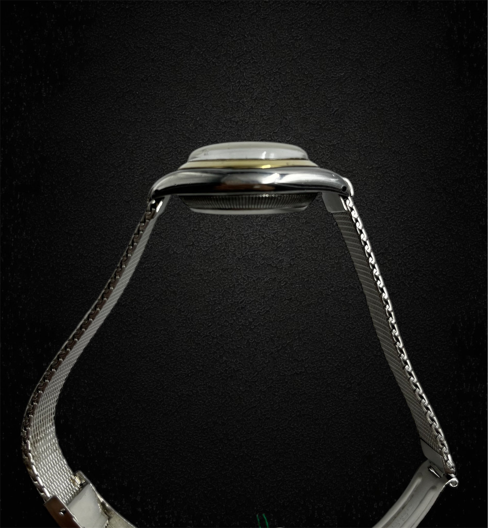 Il soprannome “Ovetto” deriva dalla tipica forma arrotondata e compatta della cassa, che misura 32 mm di diametro, rendendolo un orologio discreto ma carico di personalità. L’estetica riflette l’influenza Art Déco dell’epoca, con proporzioni armoniose e una costruzione solida, oggi sempre più difficile da reperire in condizioni originali.