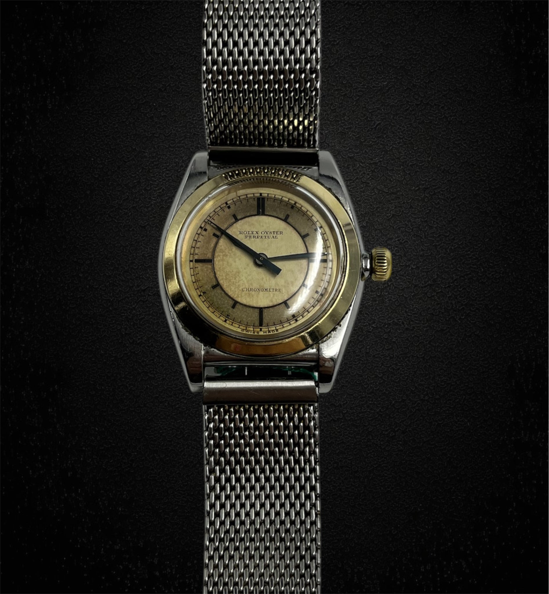 Questo raro esemplare di Rolex "Ovetto" referenza 3133, risalente alla fine degli anni ’30, è un perfetto esempio di stile, tecnica e storia. Dotato di una cassa in acciaio inossidabile con lunetta fissa in oro giallo 18 carati, unisce linee eleganti e dettagli preziosi con una robustezza pensata per durare nel tempo.