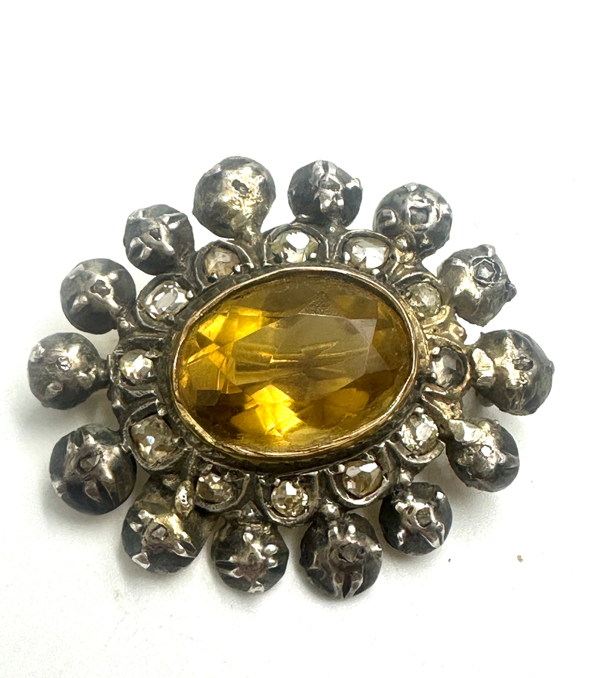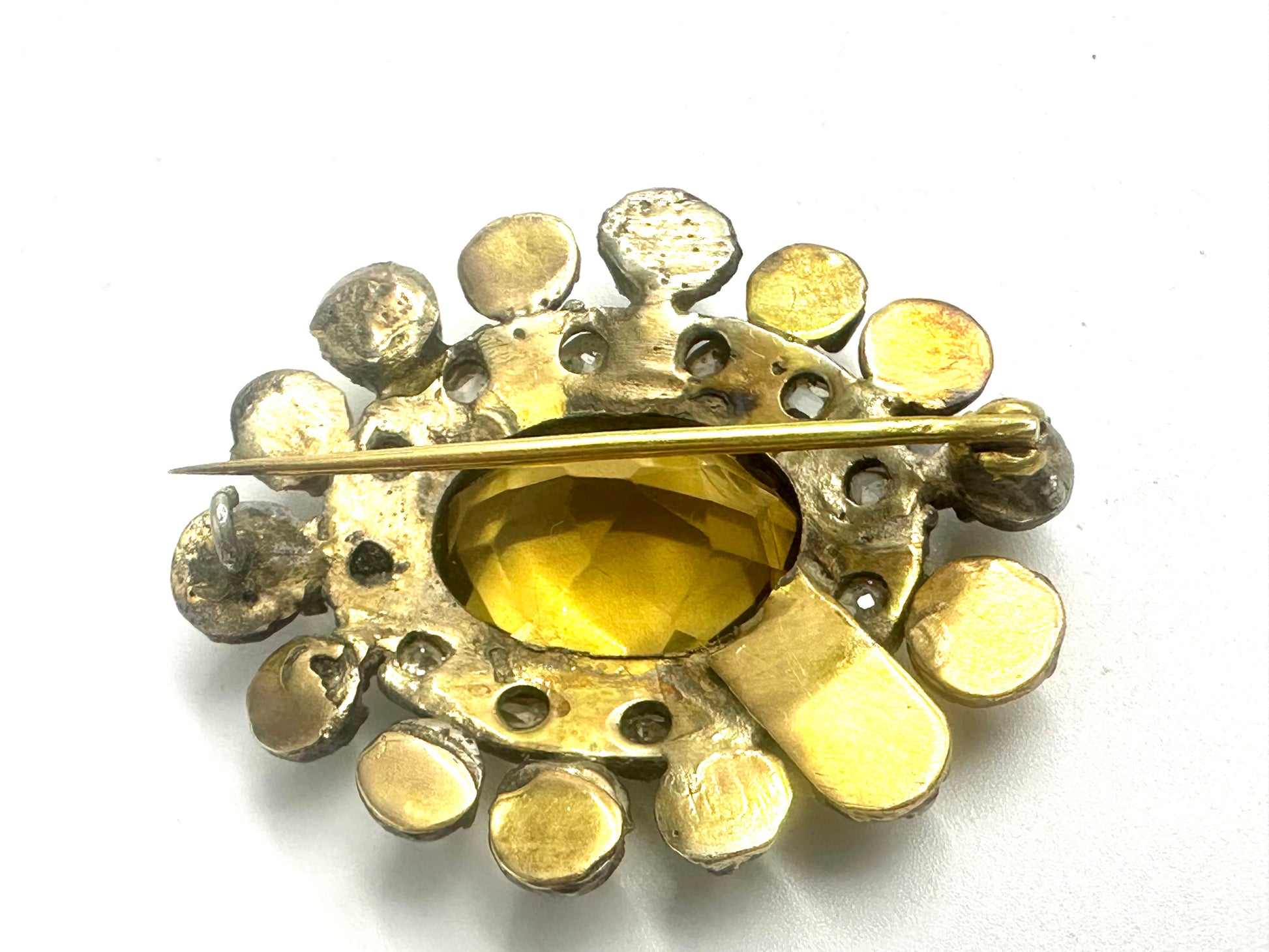 Questa spilla, a forma di sole irradiante, presenta una struttura in argento e oro, un connubio classico di materiali preziosi che esalta il suo fascino storico.