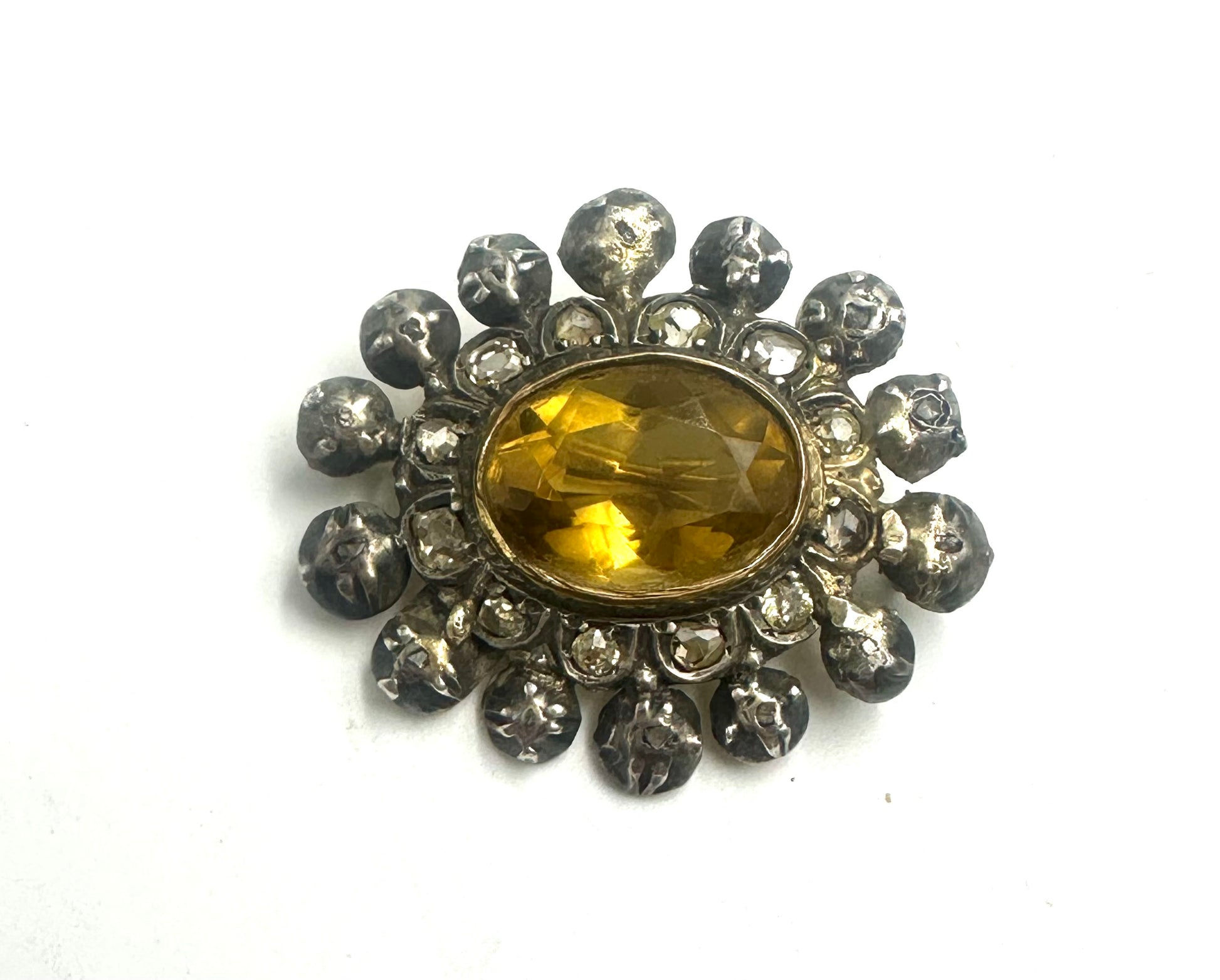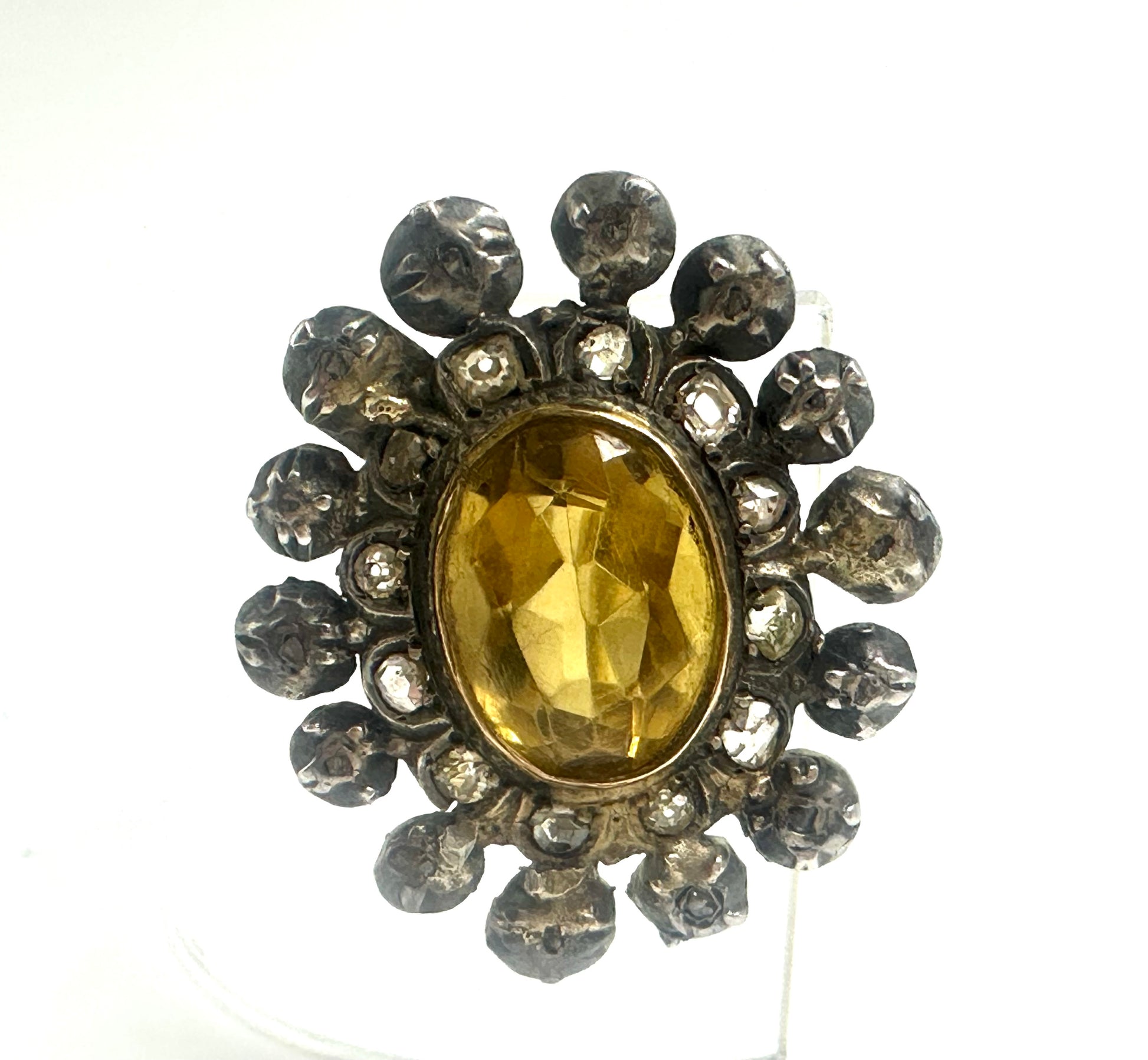 Al centro, un quarzo citrino di taglio ovale sfaccettato emana una calda luminosità dorata, circondato da un'aura di diamanti taglio rosa, per un totale stimato di 0,30 carati. Le linee delicate e il design solare simboleggiano vitalità e luce, rendendo questo pezzo non solo un accessorio elegante, ma anche un'opera d'arte carica di significato.