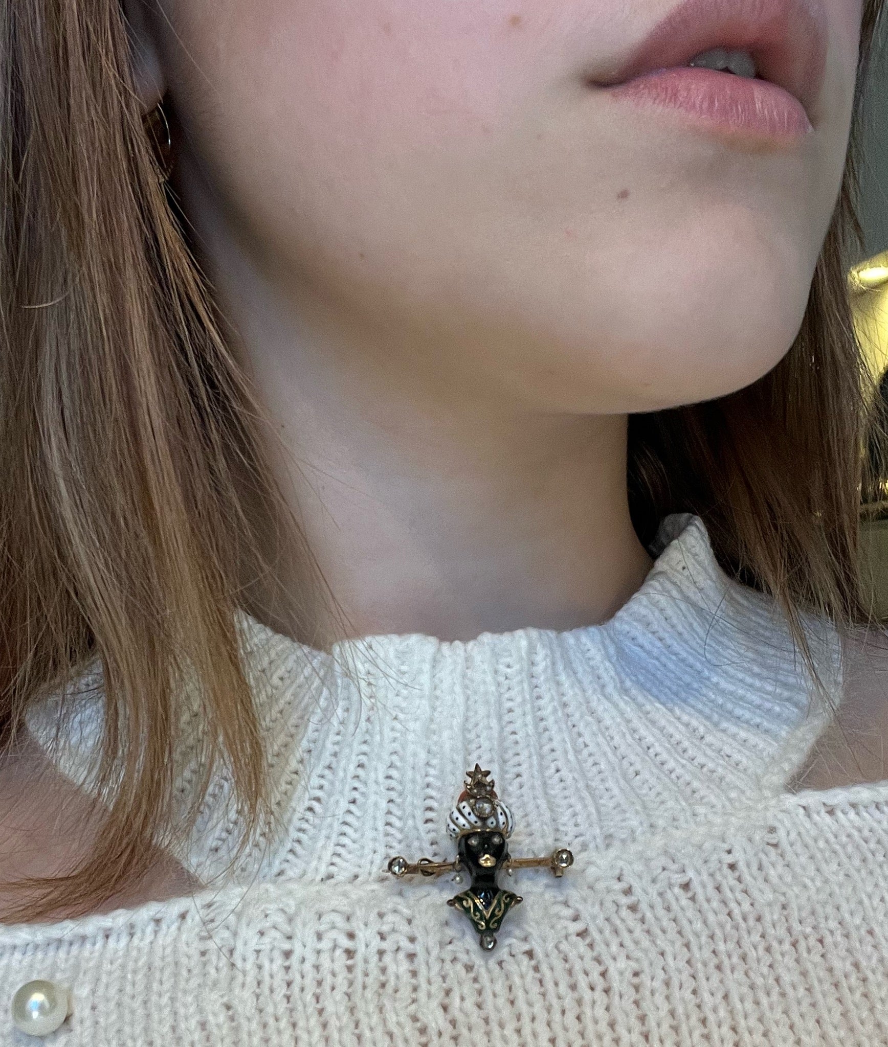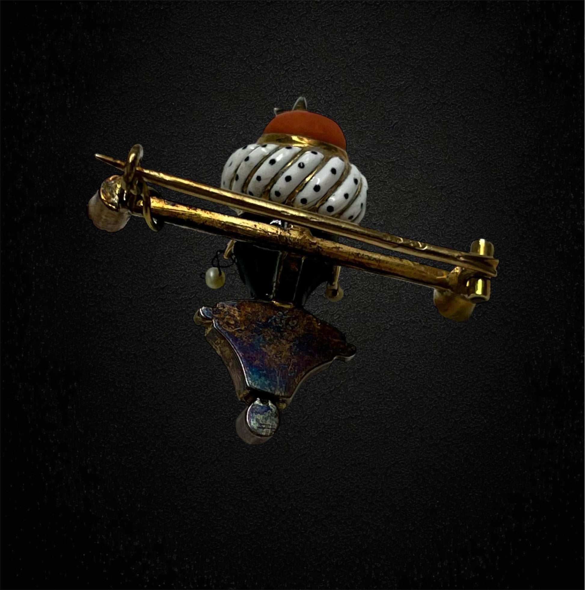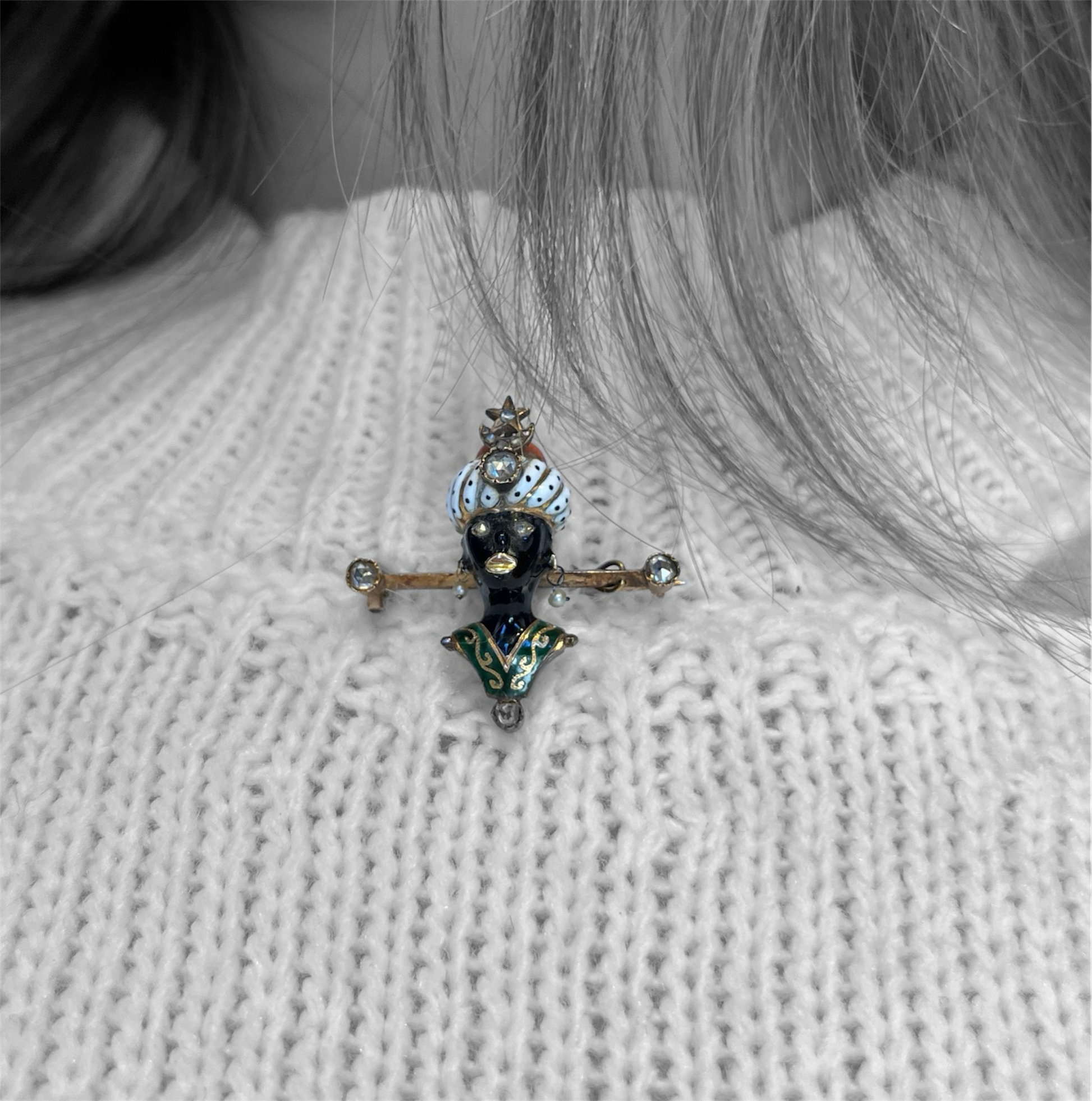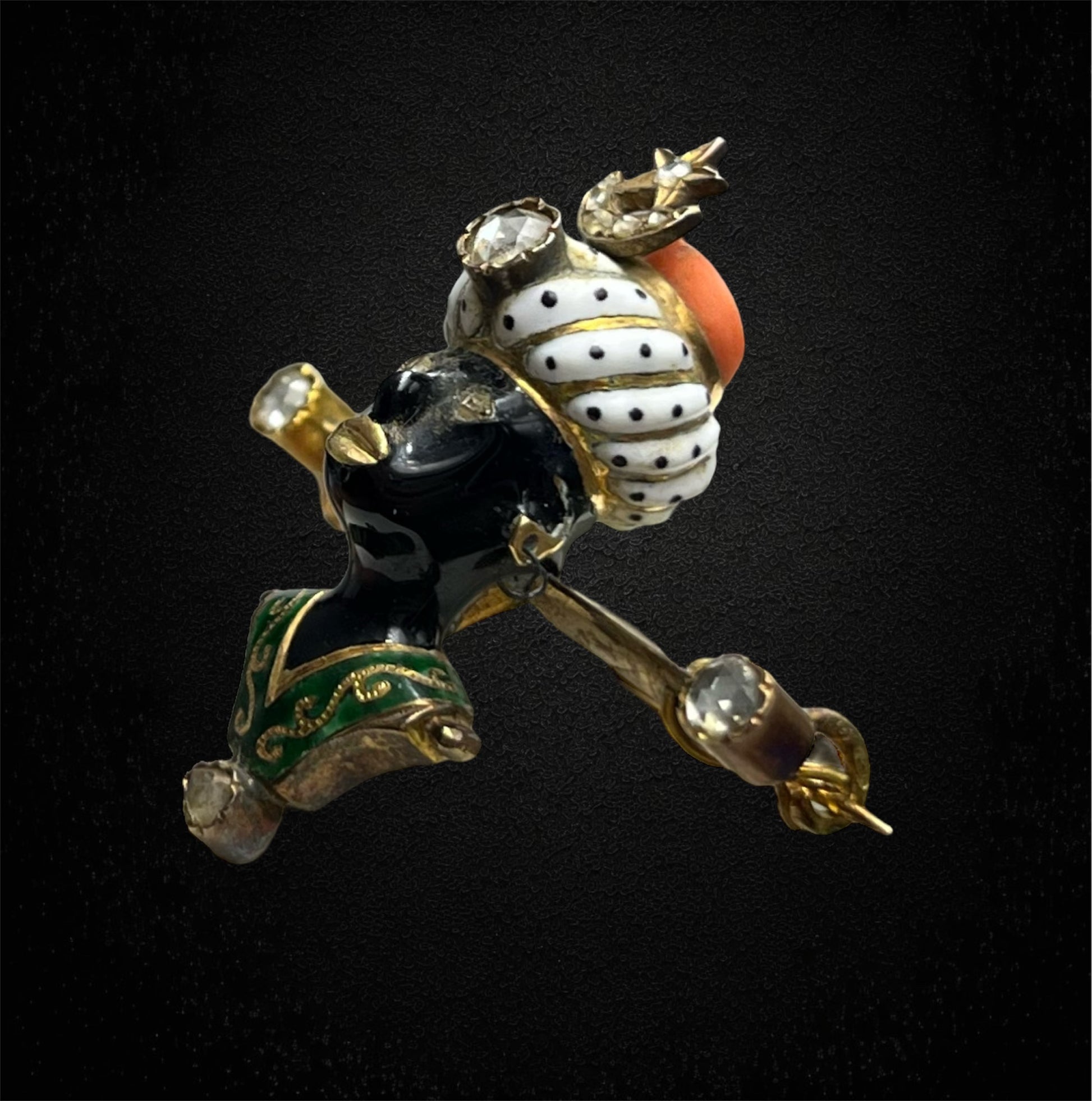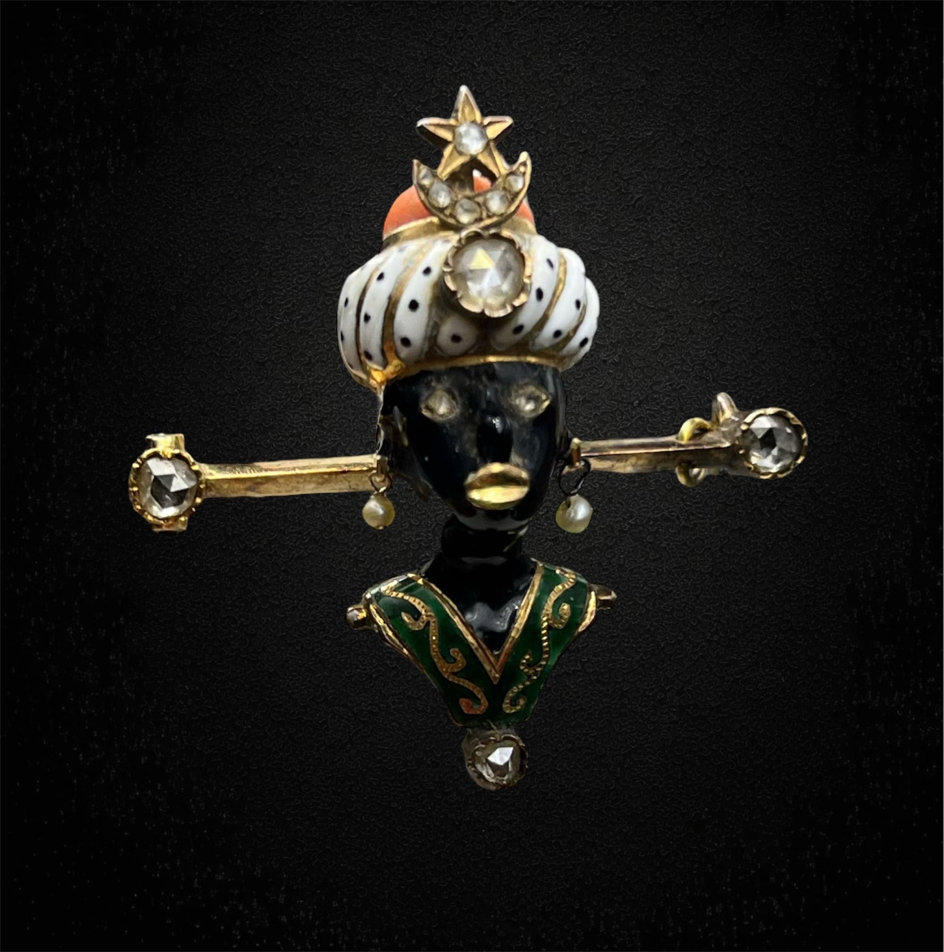 L’elaborato design e la precisione dei dettagli suggeriscono l’impiego di tecniche orafe avanzate, come l’incisione a bulino, la granulazione e l’intarsio con smalti cloisonné o champlevé. La costruzione della spilla evidenzia una perfetta armonia tra la struttura dorata e gli smalti policromi, esaltando il carattere distintivo del "moretto".