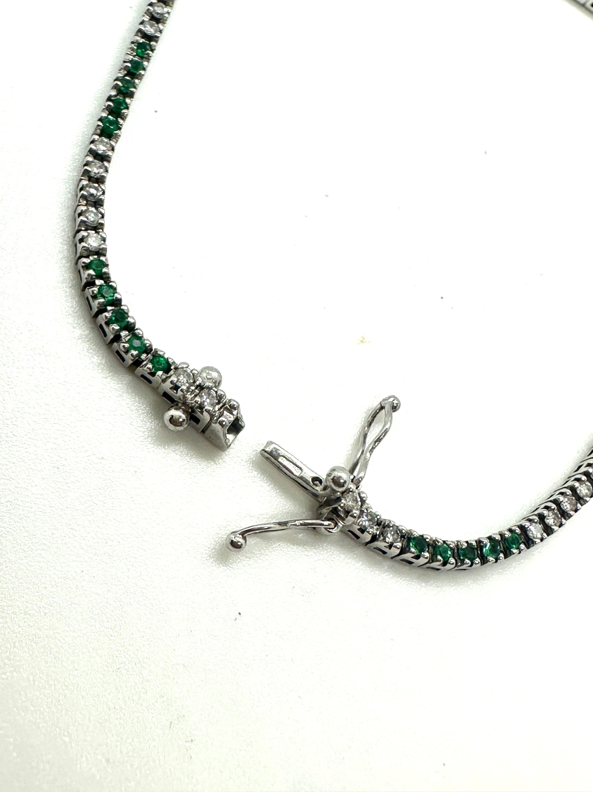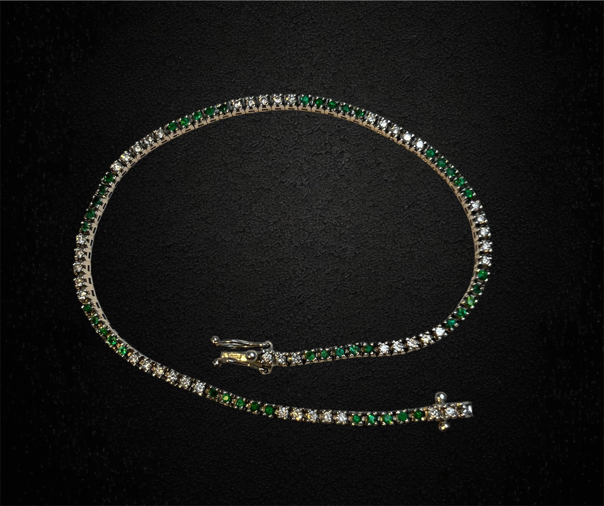 Questo raffinato bracciale è impreziosito da un'alternanza di pietre preziose incolori e verdi, che creano un contrasto cromatico armonioso e brillante. Le 46 pietre incolori, diamanti naturali dalla forma rotonda e taglio brillante, hanno un peso complessivo di circa 0,46 carati (0,01 carati ciascuno).