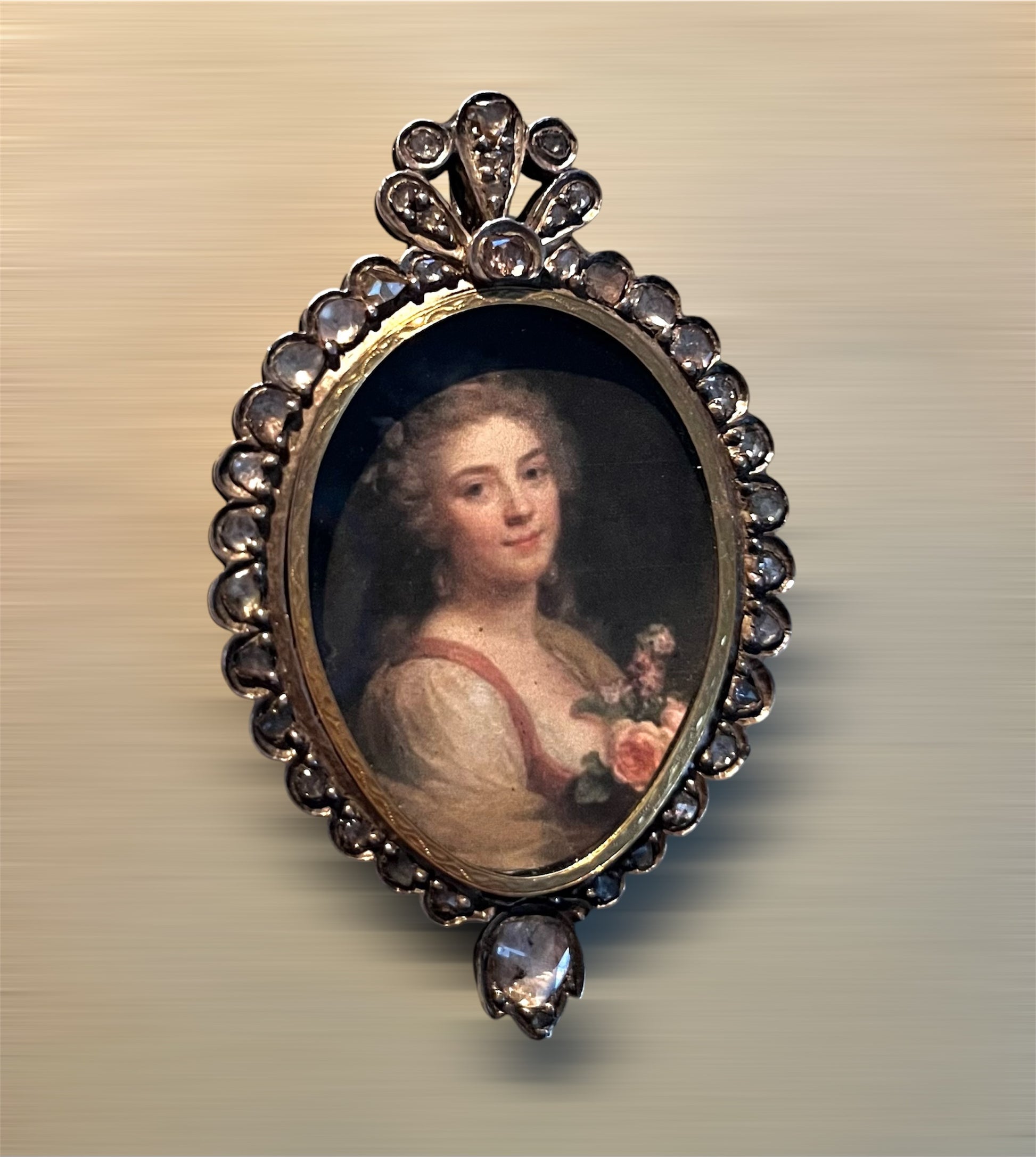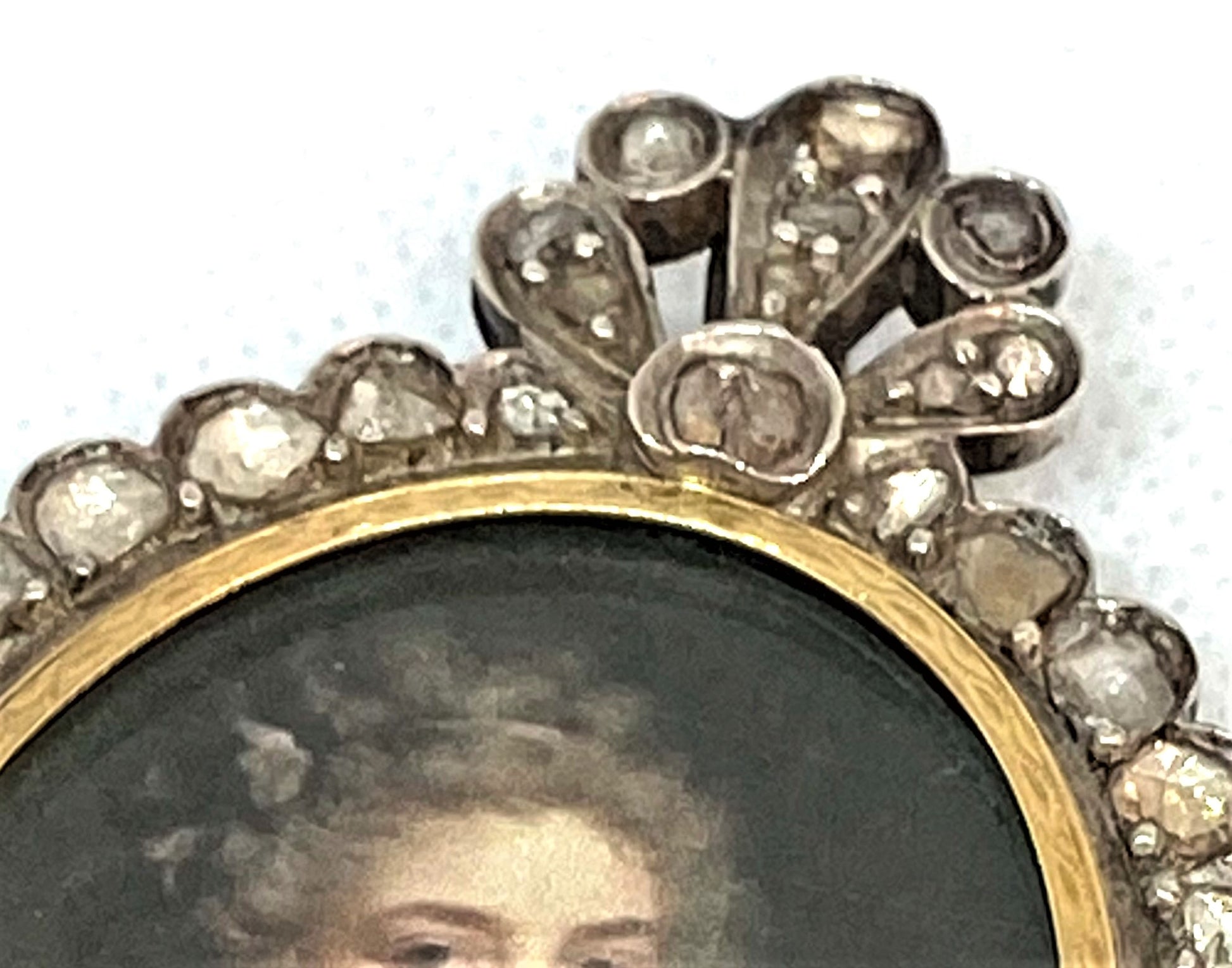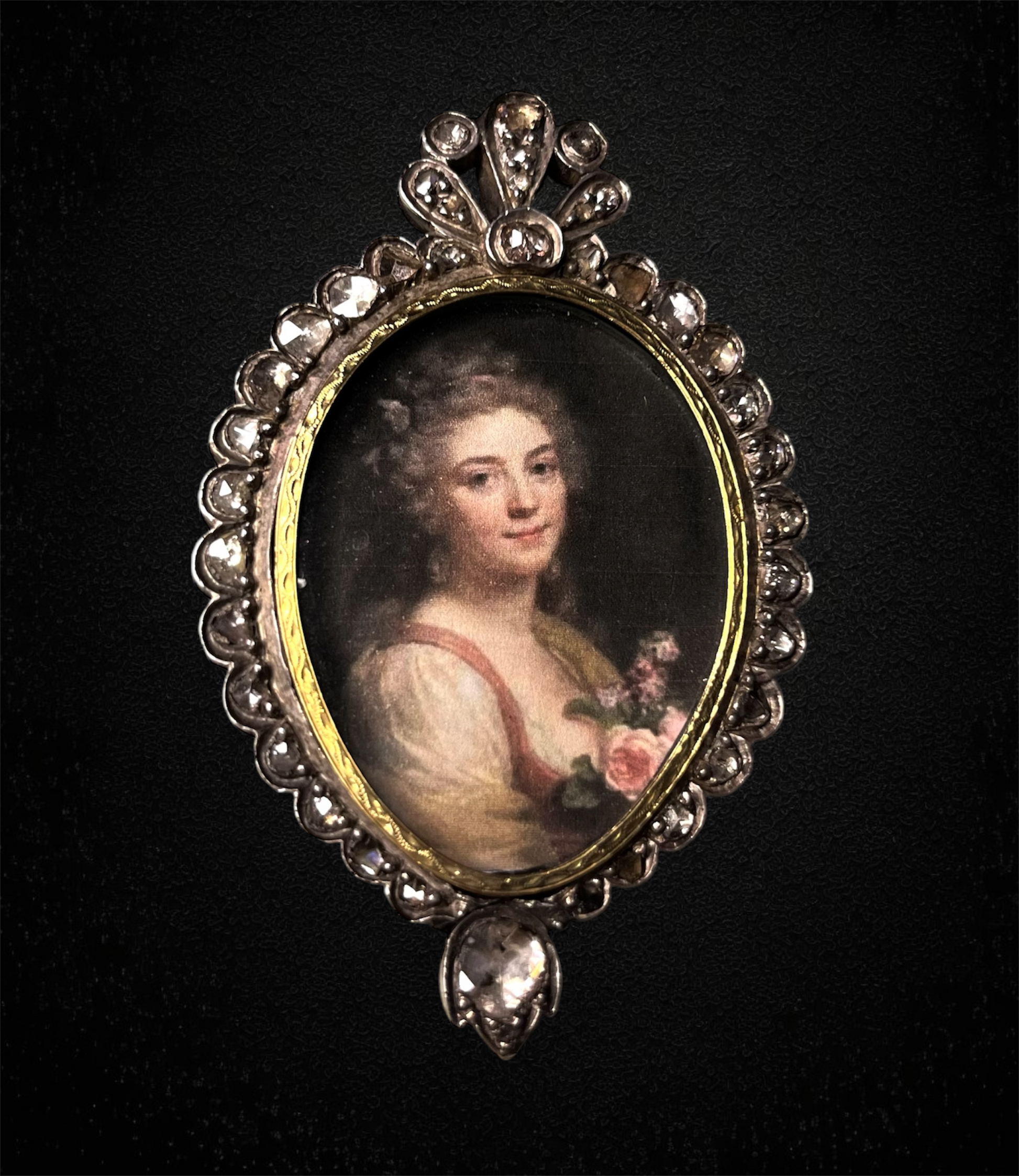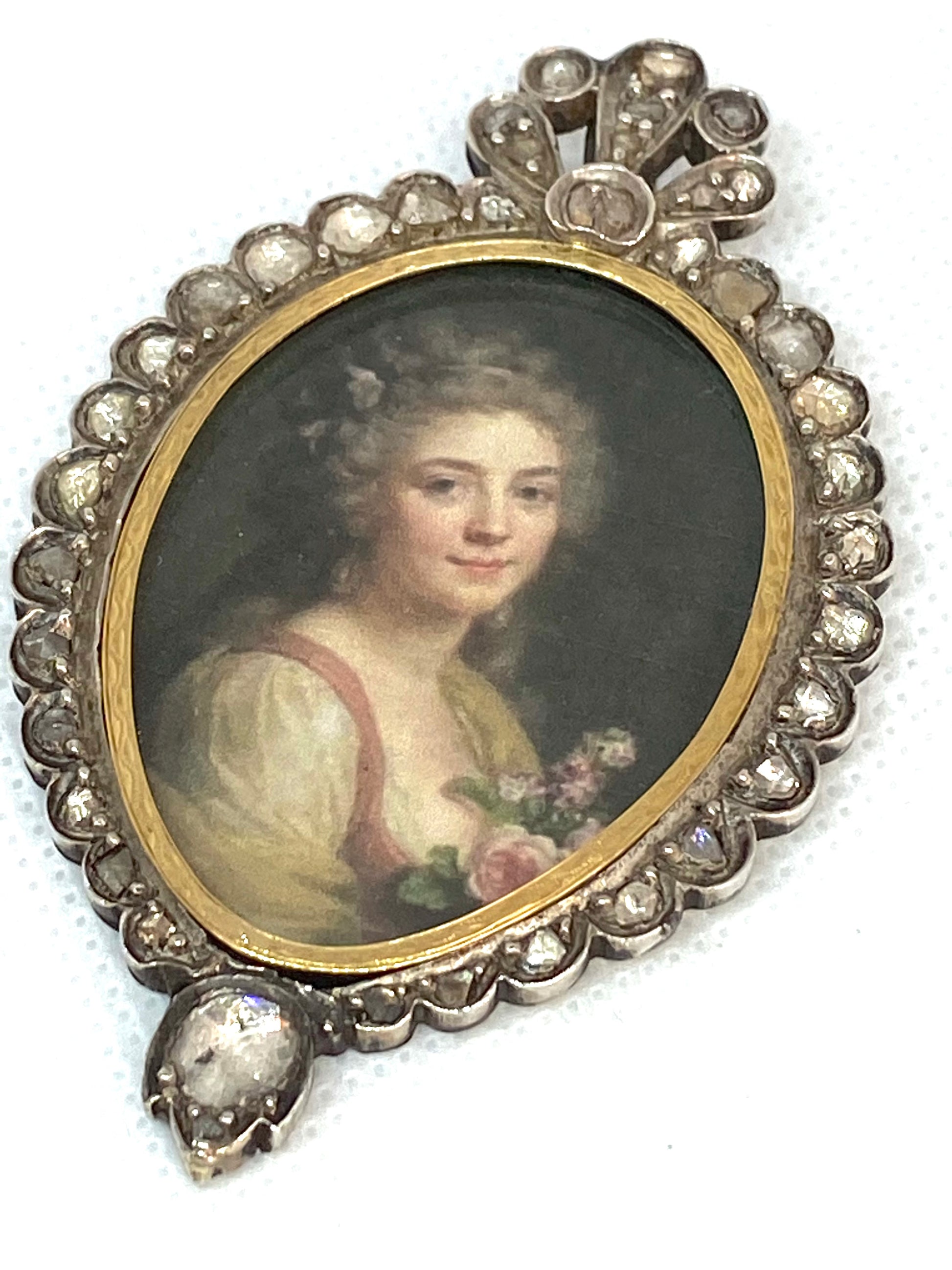 Questo ciondolo realizzato a mano, risalente all'era austro-ungarica, presenta un'elegante cornice in diamanti naturali "rose cut" da 5 ct, abilmente incastonata in argento e oro.